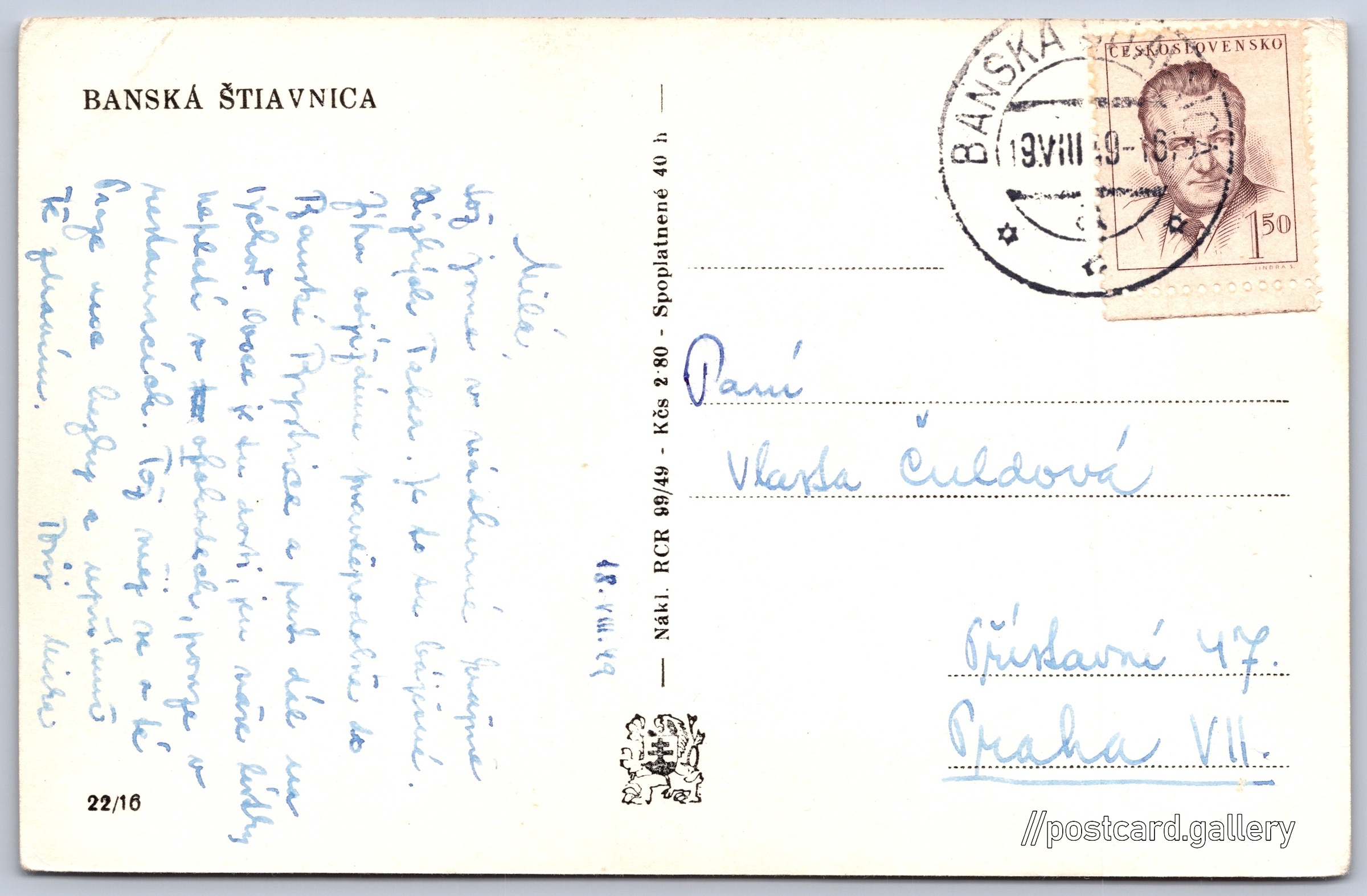 Banská Štiavnica Pokud chcete vidět pohlednice ve vyšším rozlišení nebo zobrazovat jejich zadní stranu, tak se prosím nejdříve přihlašte Log in Register BANSKÁ ŠTIAVNICA Language of printed text on postcard: Slovak Banská Štiavnica, Město, Slovensko show on map Publisher: RCR (Czechoslovakia) Estimated issue date of postcard: 1946 - 1949 Help us specify date of postcard publishing Postcard size (w x h) and shape: 139 x 90 mm (5.47" x 3.54"), rectangle Used postcard:Stamp date: 19.8.1949Write date: 18.8.1949 Prices: Postcard price: 2,80 Kčs (CSK) (+0,40 Kčs fee to support tourism)Paid stamps: 1,50 Kčs (CSK) Postcard codes: 99/49 22/16 DiscussionAdd post Add new folder ... Manage folders ...