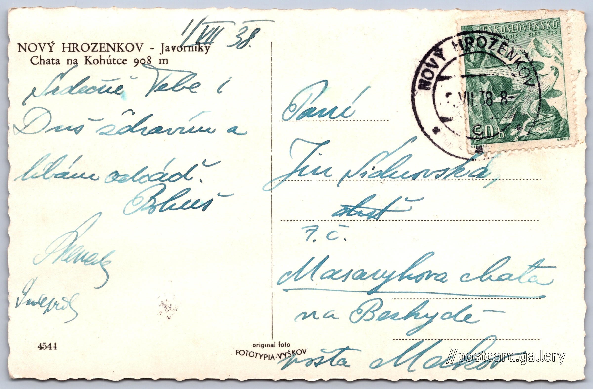 Beskydy, cottage Na Kohútce Pokud chcete vidět pohlednice ve vyšším rozlišení nebo zobrazovat jejich zadní stranu, tak se prosím nejdříve přihlašte Log in Register NOVÝ HROZENKOV - JavorníkyChata na Kohútce 908 m Language of printed text on postcard: Czech Nový Hrozenkov 241, Nový Hrozenkov, 756 04, Vsetín show on map 2 other postcards can be found in the immediate vicinity of the place shown on the postcard Show near postcards Publisher: Fototypia - Vyškov (Czechoslovakia) Estimated issue date of postcard: 1935 - 1938 Help us specify date of postcard publishing Postcard size (w x h) and shape: 138 x 89 mm (5.43" x 3.50"), rectangle, jagged Used postcard:Stamp date: 2.7.1938Write date: 1.7.1938 Prices: Paid stamps: 0,50 Kčs (CSK) Postcard codes: 4544 DiscussionAdd post Add new folder ... Manage folders ...