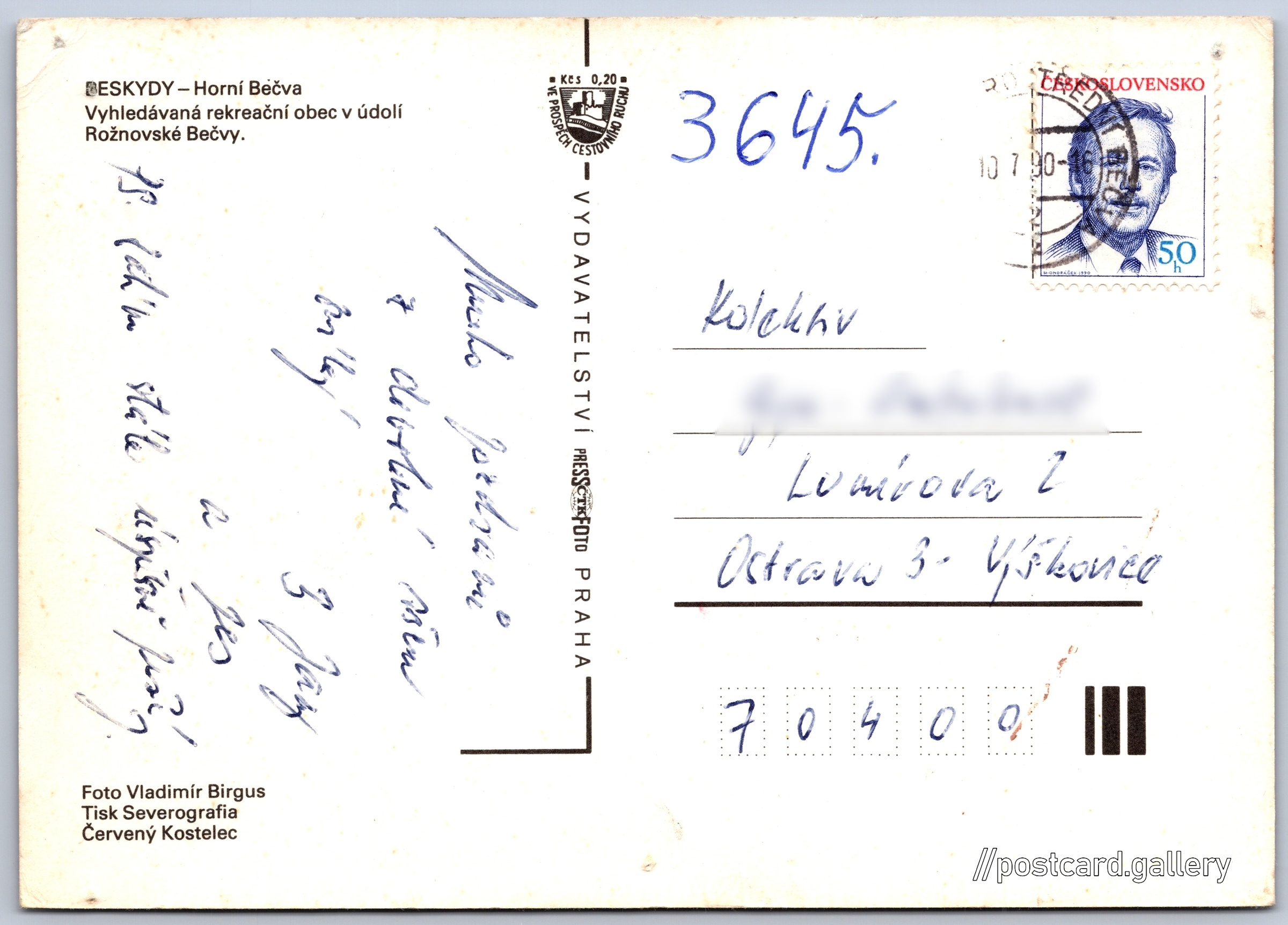 Beskydy, Horní Bečva Pokud chcete vidět pohlednice ve vyšším rozlišení nebo zobrazovat jejich zadní stranu, tak se prosím nejdříve přihlašte Log in Register Horní Bečva BESKYDY - Horní BečvaVyhledávaná rekreační obec v údolí Rožnovské Bečvy. Language of printed text on postcard: Czech Horní Bečva, Obec, Česko show on map Publisher: PressFoto Praha (Czechoslovakia) Estimated issue date of postcard: 1987 - 1990 Help us specify date of postcard publishing Postcard size (w x h) and shape: 148 x 105 mm (5.83" x 4.13"), rectangle Persons connected with this postcard: Vladimír Birgus(Photo author) Used postcard:Stamp date: 10.7.1990 Prices: Fee to support turism: 0,20 Kčs (CSK)Paid stamps: 0,50 Kčs (CSK) DiscussionAdd post Add new folder ... Manage folders ...