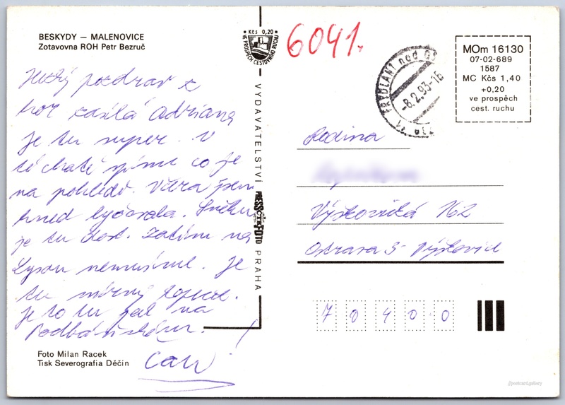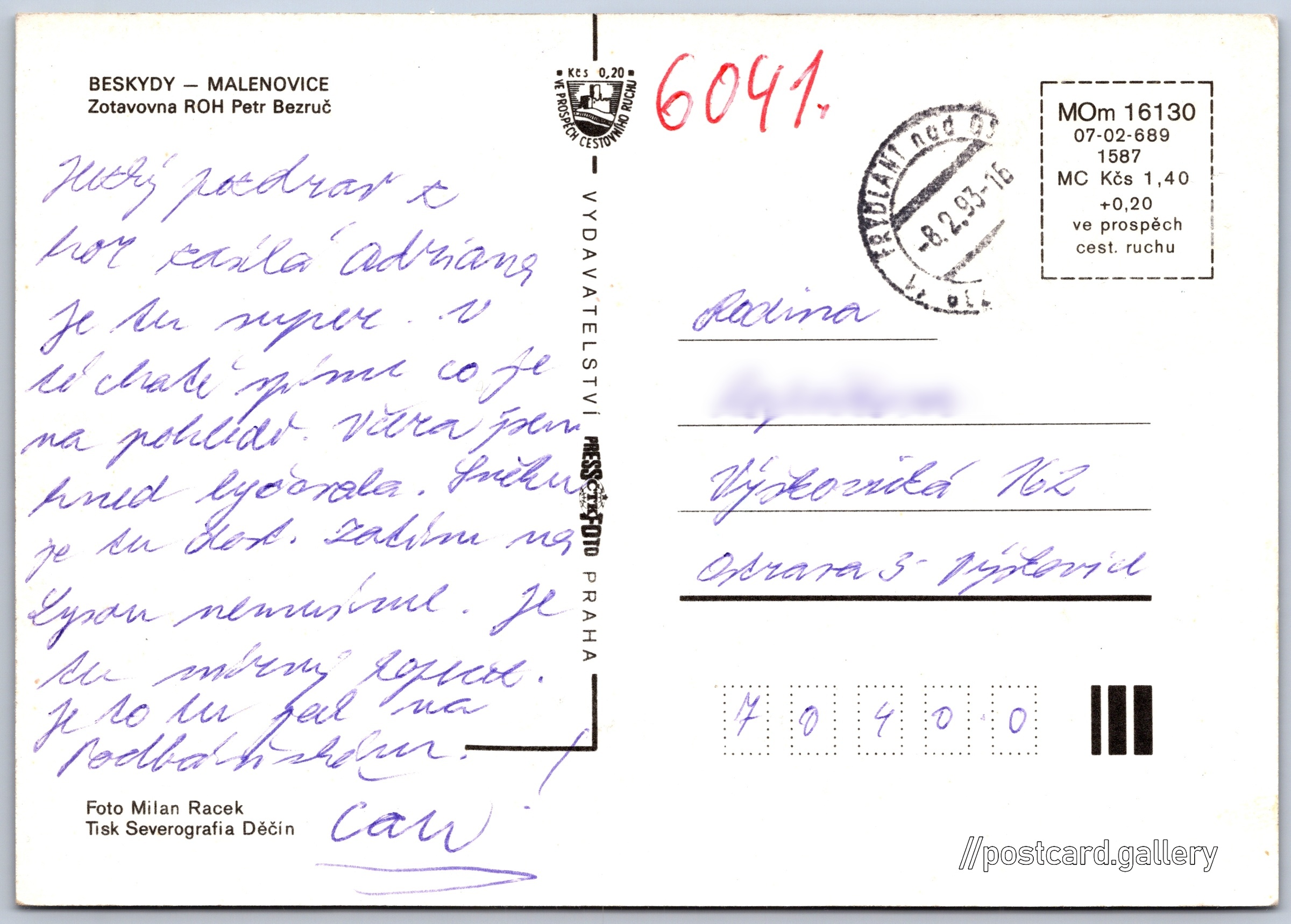 Beskydy, Malenovice Pokud chcete vidět pohlednice ve vyšším rozlišení nebo zobrazovat jejich zadní stranu, tak se prosím nejdříve přihlašte Log in Register Beskydy - Malenovice, Zotavovna Petr Bezruč BESKYDY - MALENOVICEZotavovna ROH Petr Bezruč Language of printed text on postcard: Czech Hotel Petr Bezruč, Malenovice ev. č. 327, Malenovice, Česko show on map Publisher: PressFoto Praha (Czechoslovakia) Issue year of postcard: 1986 Postcard size (w x h) and shape: 148 x 104 mm (5.83" x 4.09"), rectangle Persons connected with this postcard: Milan Racek(Photo author) Used postcard:Stamp date: 8.2.1993 Prices: Postcard price: 1,40 Kčs (CSK) (+0,20 Kčs fee to support tourism) Postcard codes: MOm 16130 07-02-689 1587 DiscussionAdd post Add new folder ... Manage folders ...