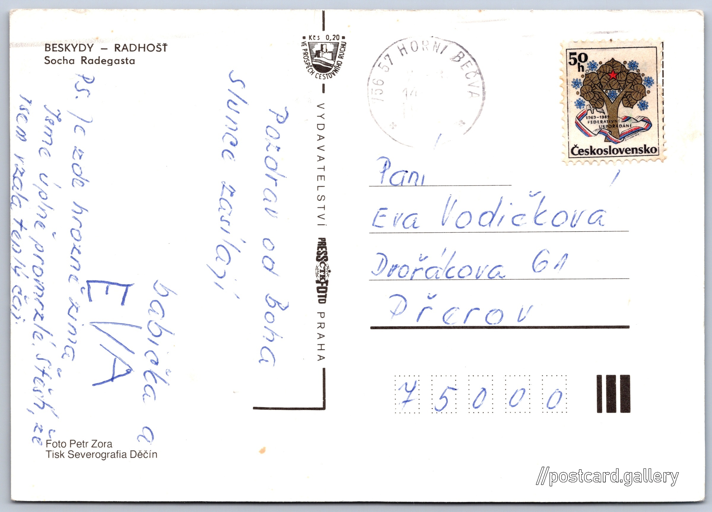 Beskydy Mountains, statue of Radegast Pokud chcete vidět pohlednice ve vyšším rozlišení nebo zobrazovat jejich zadní stranu, tak se prosím nejdříve přihlašte Log in Register BESKYDY - RADHOŠŤSocha Radegasta Language of printed text on postcard: Czech F7M3+25 Dolní Bečva, Czechia show on map 32 other postcards can be found in the immediate vicinity of the place shown on the postcard Show near postcards Publisher: PressFoto Praha (Czechoslovakia) Issue date of postcard is not known Help us estimate date of postcard publishing Postcard size (w x h) and shape: 148 x 105 mm (5.83" x 4.13"), rectangle Persons connected with this postcard: Petr Zora(Photo author) Used postcard Prices: Fee to support turism: 0,20 Kčs (CSK)Paid stamps: 0,50 Kčs (CSK) DiscussionAdd post Add new folder ... Manage folders ...