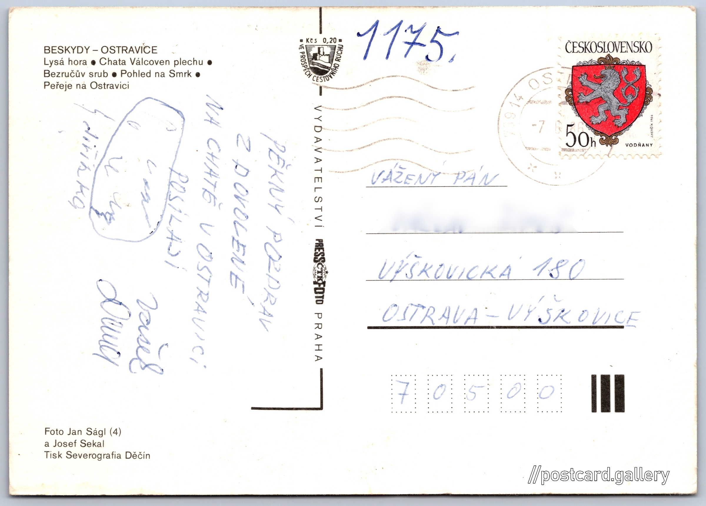 Beskydy - Ostravice Pokud chcete vidět pohlednice ve vyšším rozlišení nebo zobrazovat jejich zadní stranu, tak se prosím nejdříve přihlašte Log in Register Beskydy - Ostravice BESKYDY - OSTRAVICE- Lysá hora- Chata Válcoven plechu- Bezručův srub- Pohled na Smrk.- Peřeje na Ostravici Language of printed text on postcard: Czech Lysá hora (1324 m), Hora, výškový bod, Krásná, Moravskoslezský kraj, Česko show on map Publisher: PressFoto Praha (Czechoslovakia) Estimated issue date of postcard: 1983 - 1986 Help us specify date of postcard publishing Postcard size (w x h) and shape: 148 x 105 mm (5.83" x 4.13"), rectangle Persons connected with this postcard: Jan Ságl(Photo author) Josef Sekal(Photo author) Used postcard:Stamp date: 7.6.1986 Prices: Fee to support turism: 0,20 Kčs (CSK)Paid stamps: 0,50 Kčs (CSK) DiscussionAdd post Add new folder ... Manage folders ...