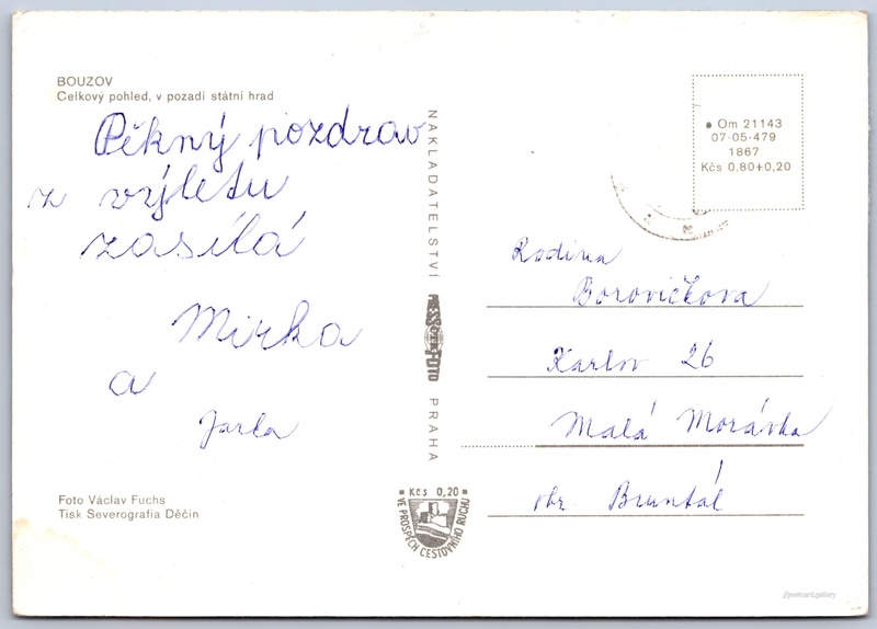 Bouzov Castle, general view Pokud chcete vidět pohlednice ve vyšším rozlišení nebo zobrazovat jejich zadní stranu, tak se prosím nejdříve přihlašte Log in Register BOUZOVCelkový pohled, v pozadí státní hrad Language of printed text on postcard: Czech Bouzov, Olomouc show on map 20 other postcards can be found in the immediate vicinity of the place shown on the postcard Show near postcards Publisher: PressFoto Praha (Czechoslovakia) Issue year of postcard: 1974 Postcard size (w x h) and shape: 147 x 104 mm (5.79" x 4.09"), rectangle Persons connected with this postcard: Václav Fuchs(Photo author) Used postcard Prices: Postcard price: 0,80 Kčs (CSK) (+0,20 Kčs fee to support tourism) Postcard codes: Om 21143 07-05-479 1867 DiscussionAdd post Add new folder ... Manage folders ...