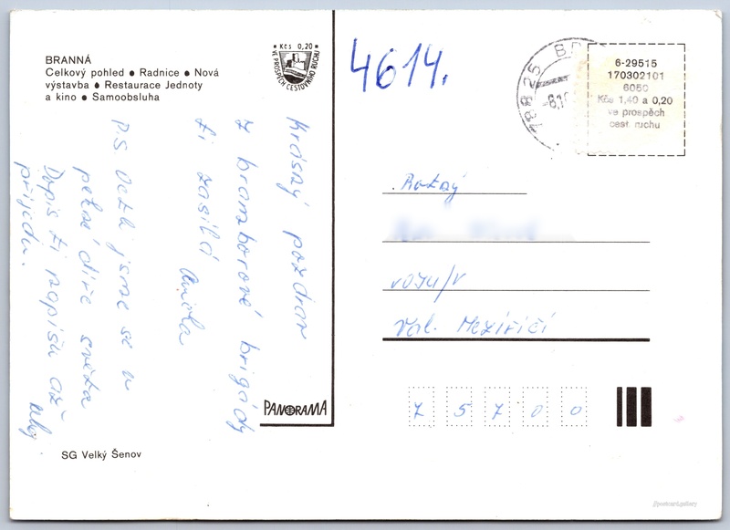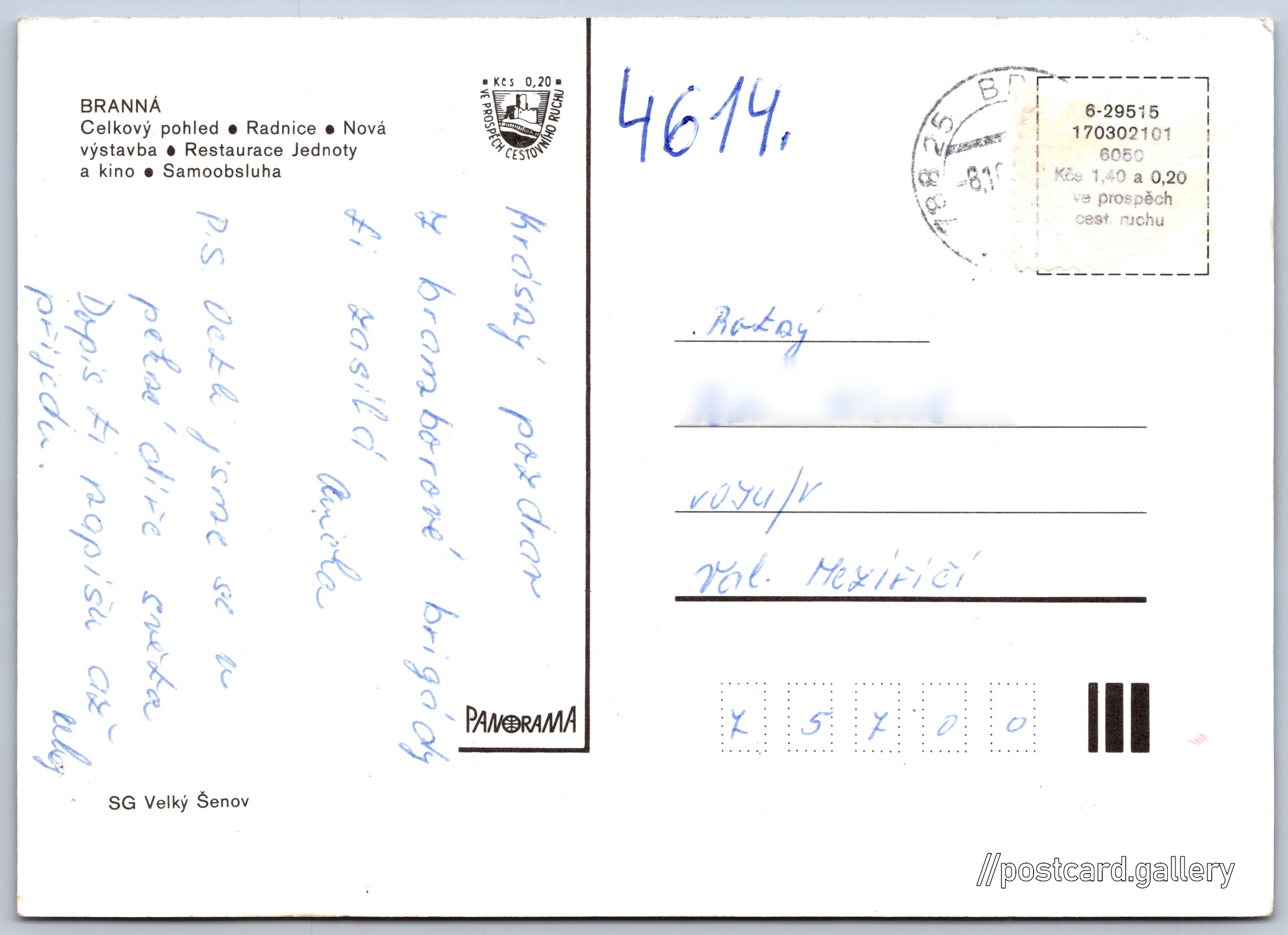 Branná Pokud chcete vidět pohlednice ve vyšším rozlišení nebo zobrazovat jejich zadní stranu, tak se prosím nejdříve přihlašte Log in Register Branná BRANNÁ- Celkový pohled- Radnice- Nová výstavba- Restaurace Jednoty a kino- Samoobsluha Language of printed text on postcard: Czech Branná, Obec, Česko show on map Publisher: Panorama (Czechoslovakia) Issue date of postcard is not known Help us estimate date of postcard publishing Postcard size (w x h) and shape: 147 x 105 mm (5.79" x 4.13"), rectangle Used postcard Prices: Postcard price: 1,40 Kčs (CSK) (+0,20 Kčs fee to support tourism) Postcard codes: 6-29515 170302101 6050 DiscussionAdd post Add new folder ... Manage folders ...