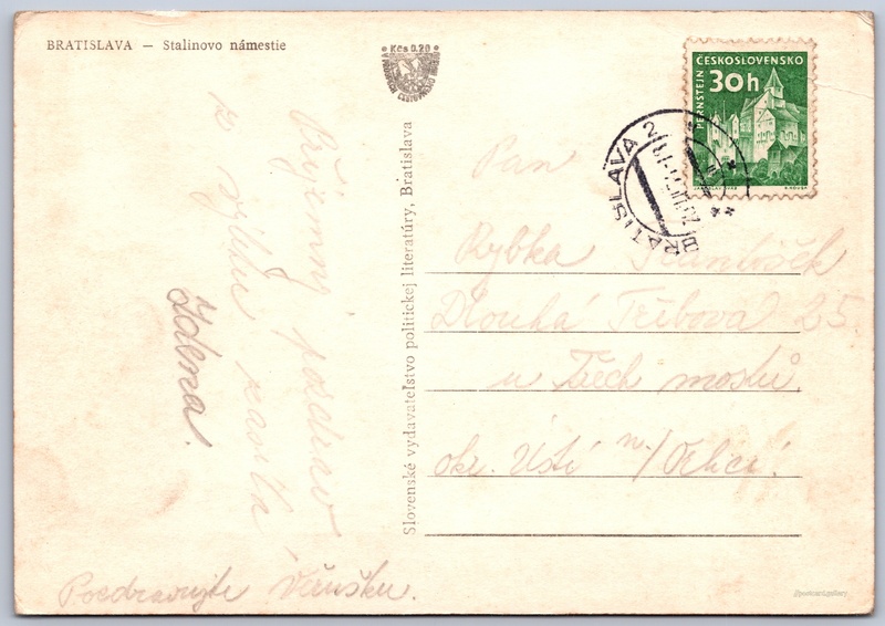 Bratislava, Stalin Square Pokud chcete vidět pohlednice ve vyšším rozlišení nebo zobrazovat jejich zadní stranu, tak se prosím nejdříve přihlašte Log in Register BRATISLAVA - Stalinovo námestie Language of printed text on postcard: Slovak Náměstí Slovenského národního povstání show on map 43 other postcards can be found in the immediate vicinity of the place shown on the postcard Show near postcards Publisher: VPL (Czechoslovakia) Estimated issue date of postcard: 1961 - 1963 Help us specify date of postcard publishing Postcard size (w x h) and shape: 144 x 101 mm (5.67" x 3.98"), rectangle Persons connected with this postcard: Josif Vissarionovič Stalin(Name in place name) Used postcard Prices: Fee to support turism: 0,20 Kčs (CSK)Paid stamps: 0,30 Kčs (CSK) DiscussionAdd post Add new folder ... Manage folders ...