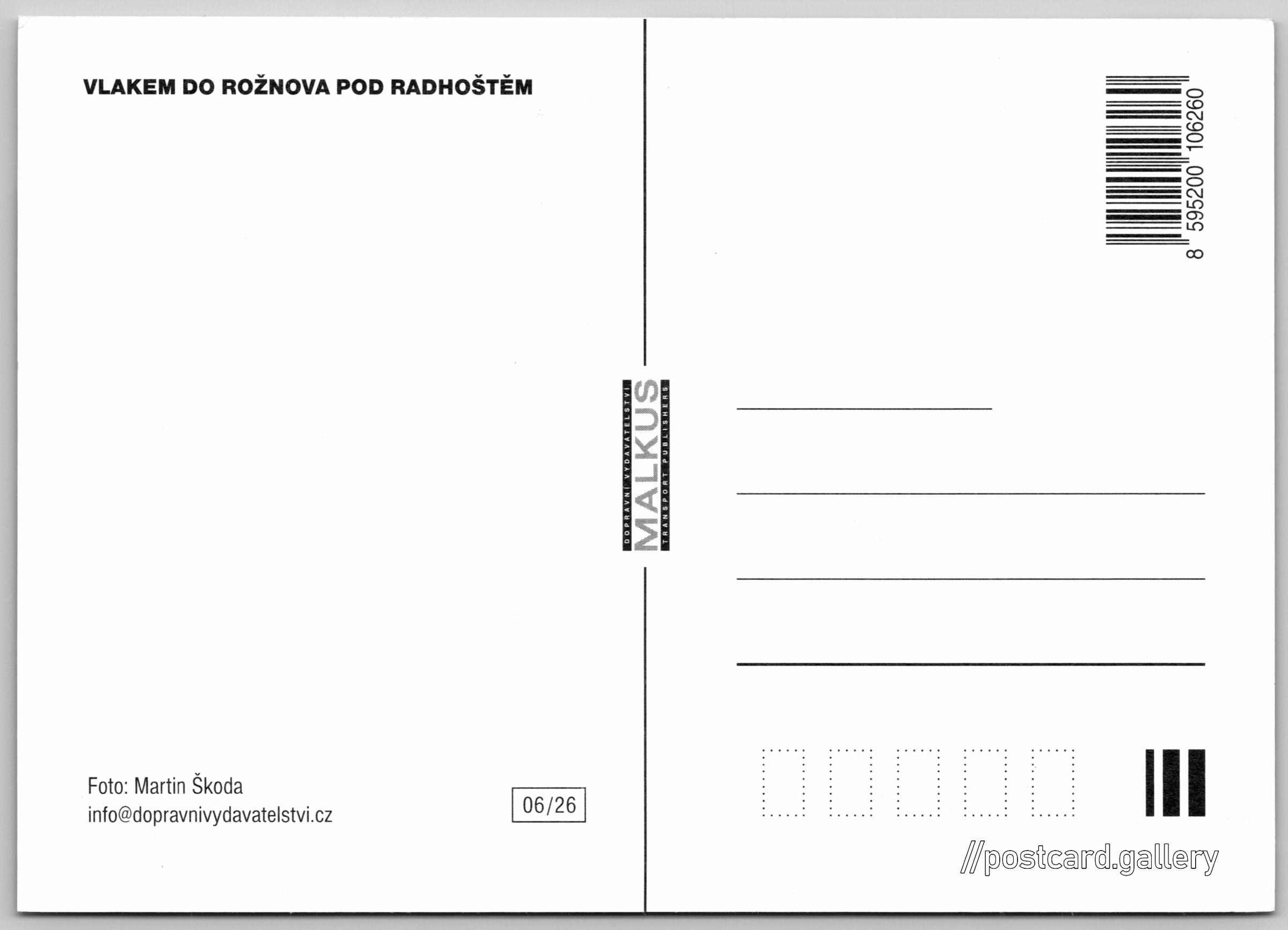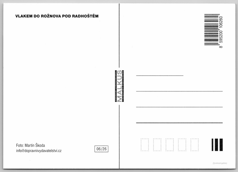By train to Rožnov pod Radhoštěm Pokud chcete vidět pohlednice ve vyšším rozlišení nebo zobrazovat jejich zadní stranu, tak se prosím nejdříve přihlašte Log in Register Vlakem do Rožnova pod Radhoštěm VLAKEM DO ROŽNOVA POD RADHOŠTĚM Language of printed text on postcard: Czech Rožnov pod Radhoštěm, Vsetín show on map Publisher: Dopravní vydavatelství Malkus (Czechia) Issue year of postcard: 2006 Postcard size (w x h) and shape: 148 x 105 mm (5.83" x 4.13"), rectangle Persons connected with this postcard: Martin Škoda(Photo author) Unused postcard Postcard codes: 06/26 8595200106260 DiscussionAdd post Add new folder ... Manage folders ...
