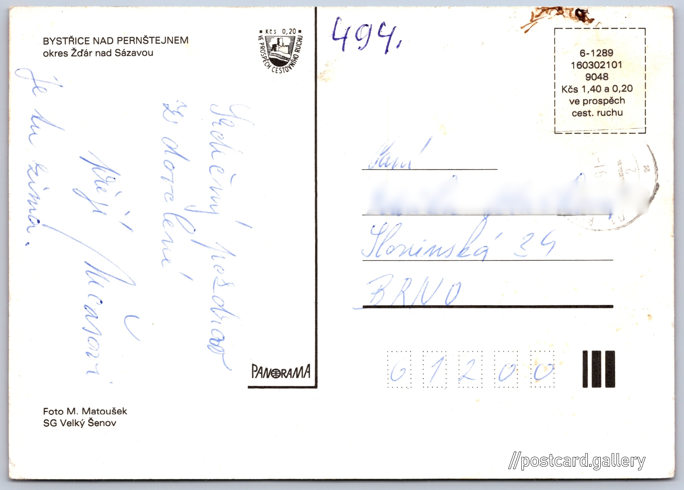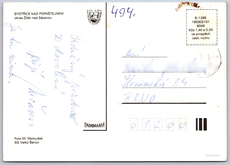 Bystřice nad Pernštejnem Pokud chcete vidět pohlednice ve vyšším rozlišení nebo zobrazovat jejich zadní stranu, tak se prosím nejdříve přihlašte Log in Register Bystřice nad Pernštejnem BYSTŘICE NAD PERNŠTEJNEMokres Žďár nad Sázavou Language of printed text on postcard: Czech Masarykovo náměstí, Bystřice nad Pernštejnem, Žďár nad Sázavou show on map Publisher: Panorama (Czechoslovakia) Estimated issue date of postcard: 1988 - 1991 Help us specify date of postcard publishing Postcard size (w x h) and shape: 147 x 103 mm (5.79" x 4.06"), rectangle Persons connected with this postcard: M. Matoušek(Photo author) Used postcard:Stamp date: 21.6.1991 Prices: Postcard price: 1,40 Kčs (CSK) (+0,20 Kčs fee to support tourism) Postcard codes: 6-1289 160302101 9048 DiscussionAdd post Add new folder ... Manage folders ...
