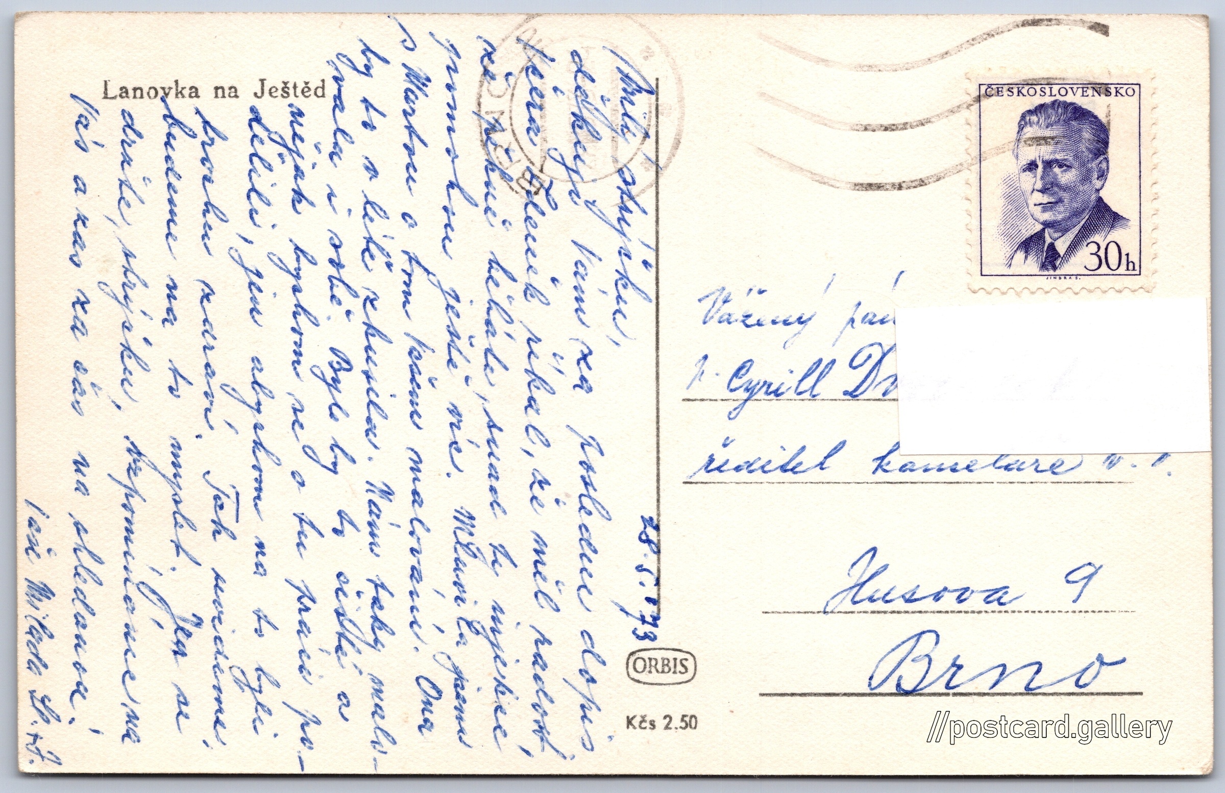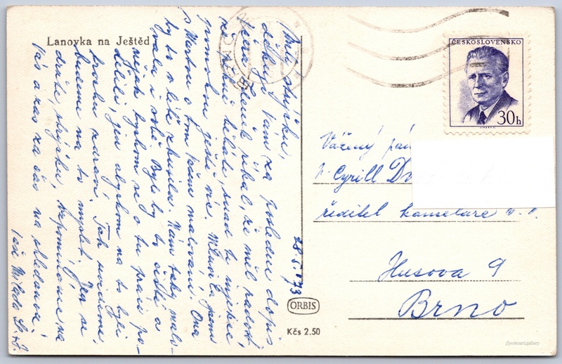 Cableway to Ještěd Pokud chcete vidět pohlednice ve vyšším rozlišení nebo zobrazovat jejich zadní stranu, tak se prosím nejdříve přihlašte Log in Register Lanovka na Ještěd Language of printed text on postcard: Czech Liberec (nečleněné město), Liberec, Liberec show on map 15 other postcards can be found in the immediate vicinity of the place shown on the postcard Show near postcards Publisher: Nakladatelství Orbis (Czechoslovakia) Estimated issue date of postcard: 1948 - 1953 Help us specify date of postcard publishing Postcard size (w x h) and shape: 140 x 89 mm (5.51" x 3.50"), rectangle Used postcard:Stamp date: 28.5.1973Write date: 28.5.1973 Prices: Postcard price: 2,50 Kčs (CSK)Paid stamps: 0,30 Kčs (CSK) DiscussionAdd post Add new folder ... Manage folders ...