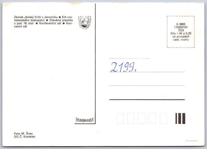 Castle Jánský Vrch Pokud chcete vidět pohlednice ve vyšším rozlišení nebo zobrazovat jejich zadní stranu, tak se prosím nejdříve přihlašte Log in Register Zámek Jánský VrchJavorník - Zámek Jánský Vrch v Javorníku- Erb vratislavského biskupství- Dřevěná plastika z poč. 16. stol.- Konferenční sál- Koncertní sál Language of printed text on postcard: Czech Zámek Jánský Vrch, Zámek, Javorník, Olomoucký kraj, Česko show on map 1 other postcard can be found in the immediate vicinity of the place shown on the postcard Show near postcards Publisher: Panorama (Czechoslovakia) Issue date of postcard is not known Help us estimate date of postcard publishing Postcard size (w x h) and shape: 147 x 105 mm (5.79" x 4.13"), rectangle Persons connected with this postcard: M. Švec(Photo author) Unused postcard Prices: Postcard price: 1,40 Kčs (CSK) (+0,20 Kčs fee to support tourism) Postcard codes: 6-3865 170302101 7024 DiscussionAdd post Add new folder ... Manage folders ...