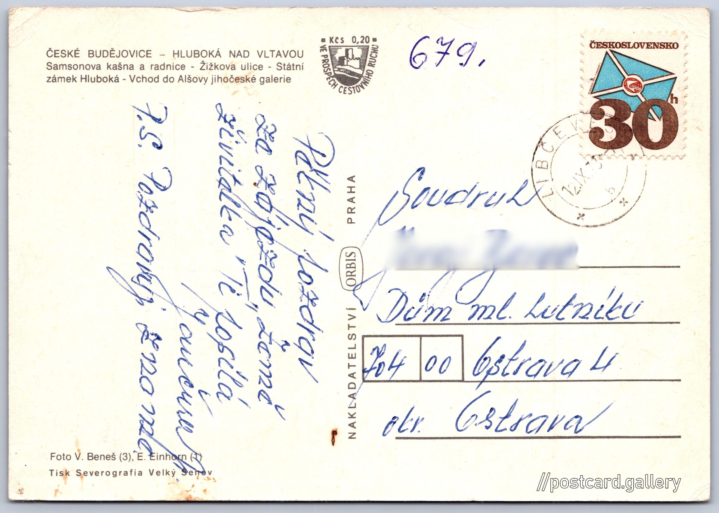 České Budějovice a Hluboká nad Vltavou Pokud chcete vidět pohlednice ve vyšším rozlišení nebo zobrazovat jejich zadní stranu, tak se prosím nejdříve přihlašte Log in Register České BudějoviceHluboká nad Vltavou ČESKÉ BUDĚJOVICE - HLUBOKÁ NAD VLTAVOU- Samsonova kašna a radnice- Žižkova ulice- Státní zámek Hluboká- Vchod do Alšovy jihočeské galerie Language of printed text on postcard: Czech Samsonova kašna, Kašna, fontána, České Budějovice 1, Česko show on map Publisher: Nakladatelství Orbis (Czechoslovakia) Estimated issue date of postcard: 1975 - 1978 Help us specify date of postcard publishing Postcard size (w x h) and shape: 148 x 103 mm (5.83" x 4.06"), rectangle Persons connected with this postcard: Erich Einhorn(Photo author) V. Beneš(Photo author) Used postcard Prices: Fee to support turism: 0,20 Kčs (CSK)Paid stamps: 0,30 Kčs (CSK) DiscussionAdd post Add new folder ... Manage folders ...