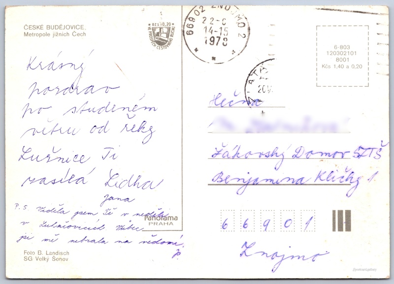 České Budějovice Pokud chcete vidět pohlednice ve vyšším rozlišení nebo zobrazovat jejich zadní stranu, tak se prosím nejdříve přihlašte Log in Register České Budějovice ČESKÉ BUDĚJOVICE,Metropole jižních Čech Language of printed text on postcard: Czech nám. Přemysla Otakara II. 1/1, České Budějovice, 370 01, České Budějovice show on map Publisher: Panorama (Czechoslovakia) Estimated issue date of postcard: 1975 - 1978 Help us specify date of postcard publishing Postcard size (w x h) and shape: 146 x 104 mm (5.75" x 4.09"), rectangle Persons connected with this postcard: Bohumil Landisch(Photo author) Used postcard:Stamp date: 20.5.1978 Prices: Postcard price: 1,40 Kčs (CSK) (+0,20 Kčs fee to support tourism) Postcard codes: 6-803 120302101 8001 DiscussionAdd post Add new folder ... Manage folders ...