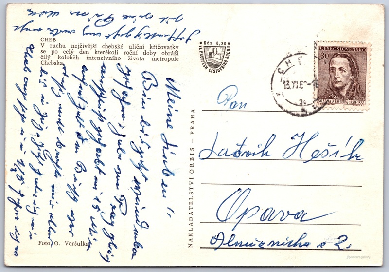 Cheb Pokud chcete vidět pohlednice ve vyšším rozlišení nebo zobrazovat jejich zadní stranu, tak se prosím nejdříve přihlašte Log in Register CHEBV ruchu nejživější chebské uliční křižovatky se po celý den kterékoli roční doby obráží koloběh intenzivního života metropole Chebska. Language of printed text on postcard: Czech Májová 588/33, Cheb, 350 02, Cheb show on map 44 other postcards can be found in the immediate vicinity of the place shown on the postcard Show near postcards Publisher: Nakladatelství Orbis (Czechoslovakia) Estimated issue date of postcard: 1959 - 1962 Help us specify date of postcard publishing Postcard size (w x h) and shape: 147 x 102 mm (5.79" x 4.02"), rectangle Persons connected with this postcard: O. Voršulka(Photo author) Used postcard:Stamp date: 13.12.1962 Prices: Fee to support turism: 0,20 Kčs (CSK)Paid stamps: 0,30 Kčs (CSK) DiscussionAdd post Add new folder ... Manage folders ...