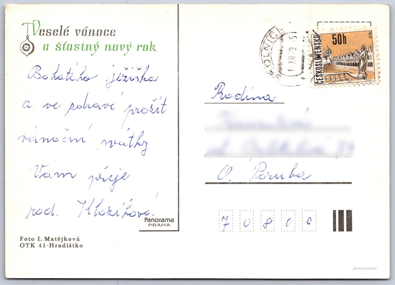 Christmas and New Year cards, clocks Pokud chcete vidět pohlednice ve vyšším rozlišení nebo zobrazovat jejich zadní stranu, tak se prosím nejdříve přihlašte Log in Register Veselé vánoce a šťastný nový rok Language of printed text on postcard: Czech Publisher: Panorama (Czechoslovakia) Issue date of postcard is not known Help us estimate date of postcard publishing Postcard size (w x h) and shape: 146 x 104 mm (5.75" x 4.09"), rectangle Persons connected with this postcard: I. Matějková(Photo author) Used postcard Prices: Paid stamps: 0,50 Kčs (CSK) DiscussionAdd post Add new folder ... Manage folders ...