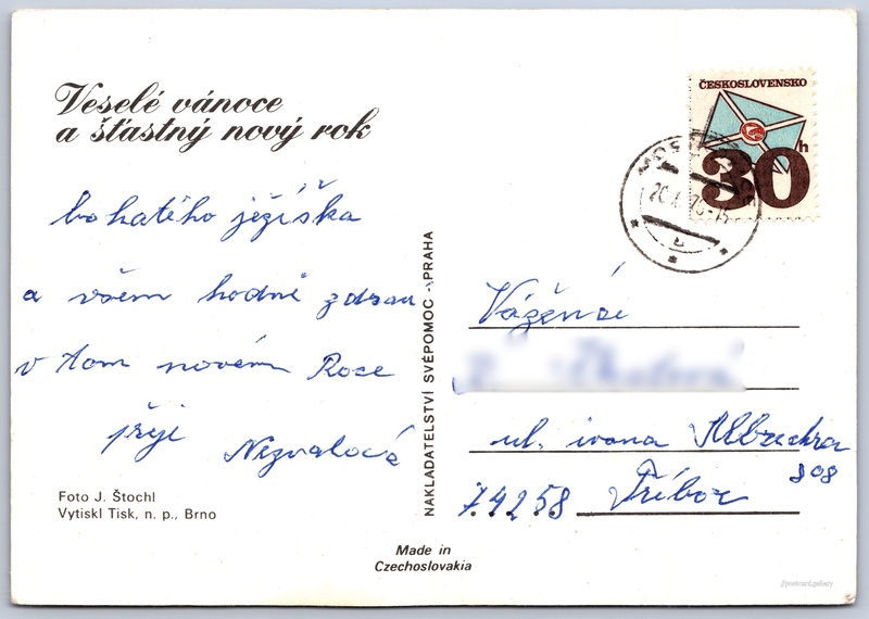 Christmas and New Year wishes Pokud chcete vidět pohlednice ve vyšším rozlišení nebo zobrazovat jejich zadní stranu, tak se prosím nejdříve přihlašte Log in Register Veselé vánoce a štastný nový rokMade in Czechoslovakia Language of printed text on postcard: Czech Publisher: Nakladatelství Svépomoc, Praha (Czechoslovakia) Estimated issue date of postcard: 1967 - 1970 Help us specify date of postcard publishing Postcard size (w x h) and shape: 147 x 103 mm (5.79" x 4.06"), rectangle Persons connected with this postcard: Josef Štochl(Photo author) Used postcard:Stamp date: 20.12.1970 Prices: Paid stamps: 0,30 Kčs (CSK) DiscussionAdd post Add new folder ... Manage folders ...