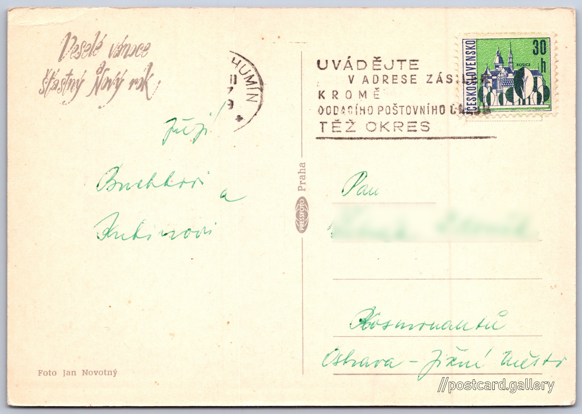Christmas and New Year wishes Pokud chcete vidět pohlednice ve vyšším rozlišení nebo zobrazovat jejich zadní stranu, tak se prosím nejdříve přihlašte Log in Register Veselé vánoce a šťastný Nový rok Language of printed text on postcard: Czech Publisher: PressFoto Praha (Czechoslovakia) Estimated issue date of postcard: 1965 - 1970 Help us specify date of postcard publishing Postcard size (w x h) and shape: 150 x 105 mm (5.91" x 4.13"), rectangle Persons connected with this postcard: Jan Novotný(Photo author) Used postcard Prices: Paid stamps: 0,30 Kčs (CSK) DiscussionAdd post Add new folder ... Manage folders ...
