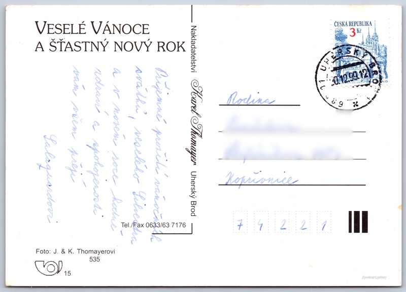 Christmas and New Year wishes 5/10 Pokud chcete vidět pohlednice ve vyšším rozlišení nebo zobrazovat jejich zadní stranu, tak se prosím nejdříve přihlašte Log in Register VESELÉ VÁNOCE A ŠŤASTNÝ NOVÝ ROK Language of printed text on postcard: Czech Publisher: Nakladatelství Thomayer (Czechoslovakia) Estimated issue date of postcard: 1996 - 1999 Help us specify date of postcard publishing Postcard size (w x h) and shape: 147 x 105 mm (5.79" x 4.13"), rectangle Persons connected with this postcard: Karel Thomayer(Photo author) J. Thomayer(Photo author) Used postcard:Stamp date: 20.12.1999 Prices: Paid stamps: 3,00 Kč (CZK) Postcard codes: 535 DiscussionAdd post Add new folder ... Manage folders ...