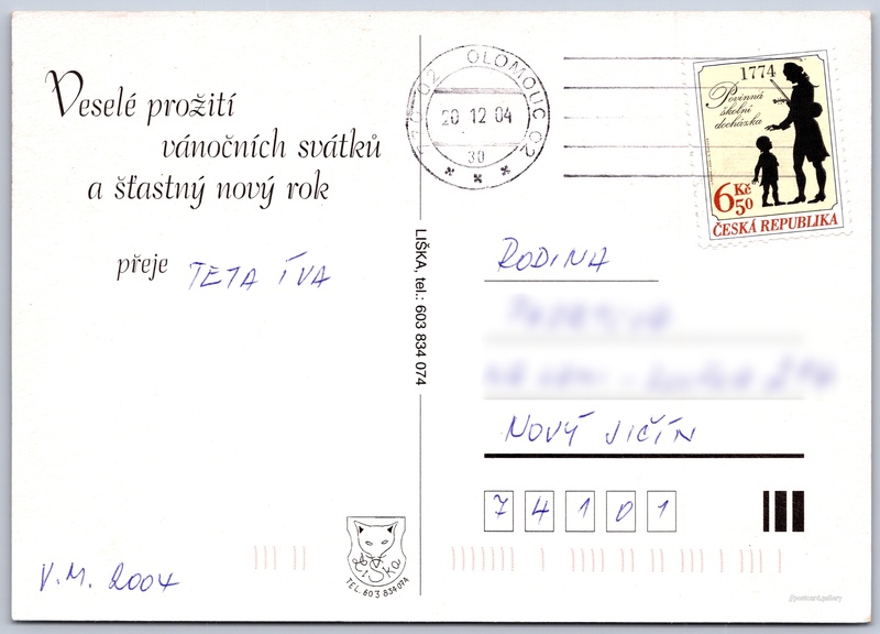 Christmas and New Year wishes Pokud chcete vidět pohlednice ve vyšším rozlišení nebo zobrazovat jejich zadní stranu, tak se prosím nejdříve přihlašte Log in Register Radostné Vánoce a šťastný nový rok Veselé prožití vánočních svátků a šťastný nový rokpřeje Language of printed text on postcard: Czech Publisher: Liška (Czechia) Estimated issue date of postcard: 2001 - 2004 Help us specify date of postcard publishing Postcard size (w x h) and shape: 147 x 105 mm (5.79" x 4.13"), rectangle Used postcard:Stamp date: 20.12.2004 Prices: Paid stamps: 6,50 Kč (CZK) DiscussionAdd post Add new folder ... Manage folders ...