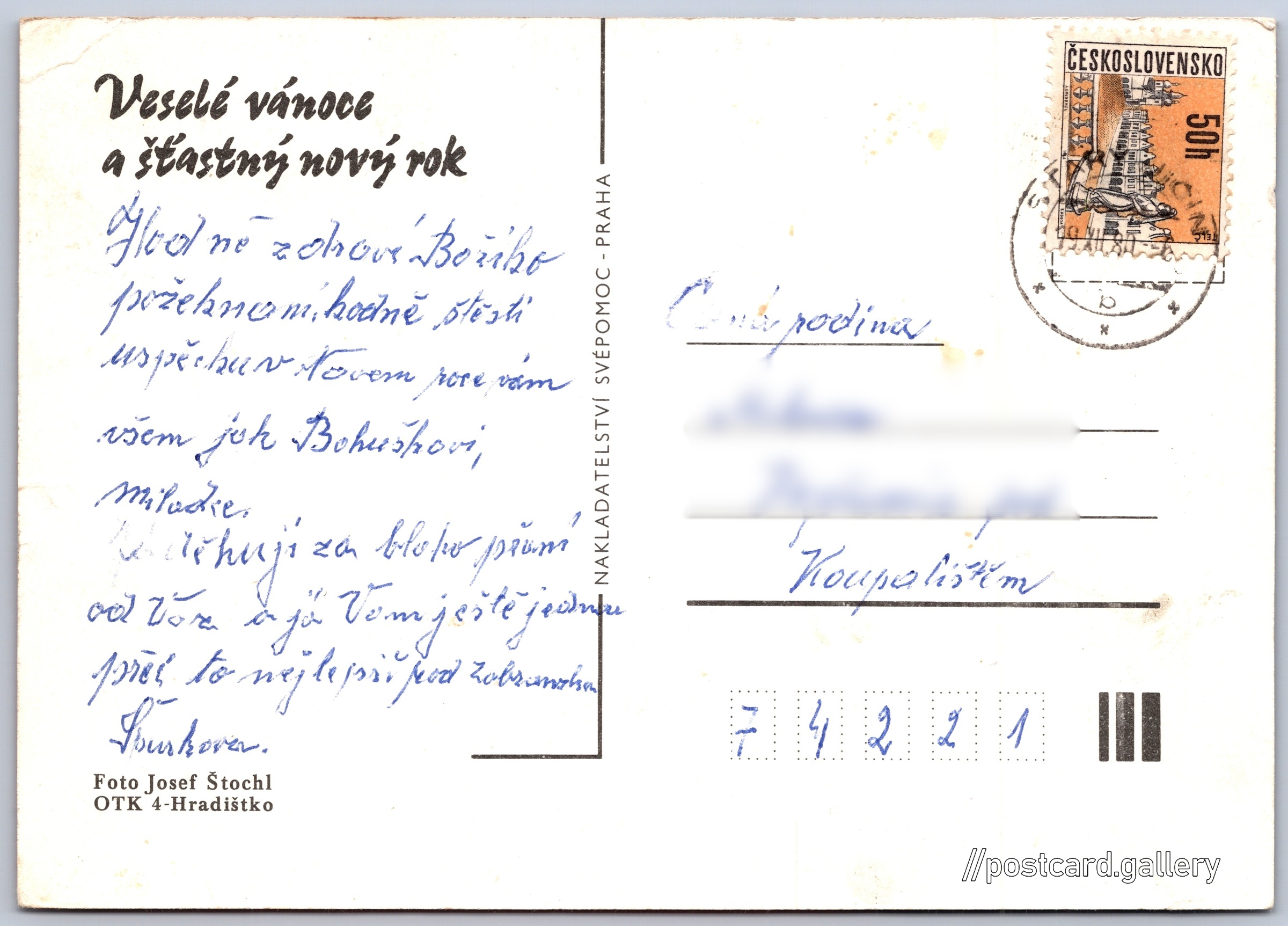 Christmas card, candles, nuts Pokud chcete vidět pohlednice ve vyšším rozlišení nebo zobrazovat jejich zadní stranu, tak se prosím nejdříve přihlašte Log in Register Veselé vánoce a šťastný nový rok Language of printed text on postcard: Czech Publisher: Nakladatelství Svépomoc, Praha (Czechoslovakia) Estimated issue date of postcard: 1977 - 1980 Help us specify date of postcard publishing Postcard size (w x h) and shape: 148 x 105 mm (5.83" x 4.13"), rectangle Persons connected with this postcard: Josef Štochl(Photo author) Used postcard:Stamp date: 19.12.1980 Prices: Paid stamps: 0,50 Kčs (CSK) DiscussionAdd post Add new folder ... Manage folders ...