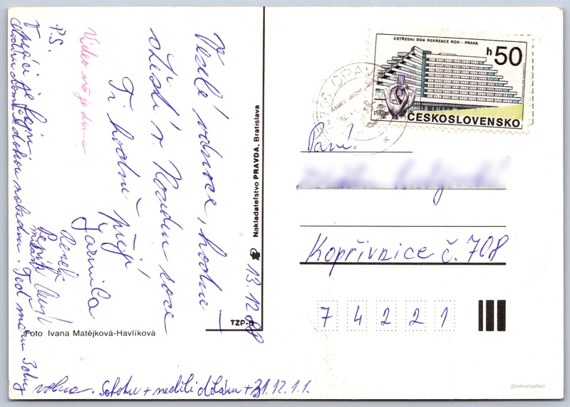 Christmas card Pokud chcete vidět pohlednice ve vyšším rozlišení nebo zobrazovat jejich zadní stranu, tak se prosím nejdříve přihlašte Log in Register Language of printed text on postcard: Czech Publisher: Nakladateľstvo PRAVDA, Bratislava (Czechoslovakia) Estimated issue date of postcard: 1985 - 1988 Help us specify date of postcard publishing Postcard size (w x h) and shape: 147 x 104 mm (5.79" x 4.09"), rectangle Persons connected with this postcard: Ivana Matějková-Havlíková(Photo author) Used postcard:Stamp date: 15.12.1988Write date: 13.12.1988 Prices: Paid stamps: 0,50 Kčs (CSK) DiscussionAdd post Add new folder ... Manage folders ...
