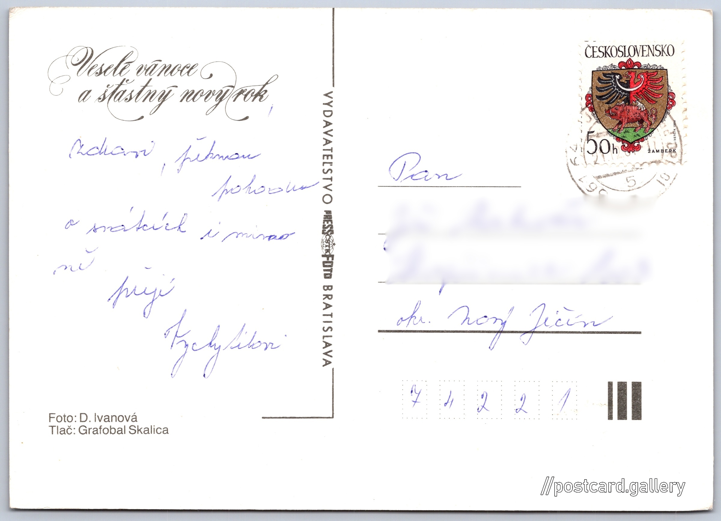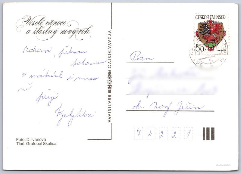 Christmas card Pokud chcete vidět pohlednice ve vyšším rozlišení nebo zobrazovat jejich zadní stranu, tak se prosím nejdříve přihlašte Log in Register Veselé vanoce a štastný nový rok Language of printed text on postcard: Czech Publisher: PressFoto Bratislava (Czechoslovakia) Estimated issue date of postcard: 1984 - 1987 Help us specify date of postcard publishing Postcard size (w x h) and shape: 147 x 105 mm (5.79" x 4.13"), rectangle Persons connected with this postcard: D. Ivanová(Photo author) Used postcard:Stamp date: 21.12.1987 Prices: Paid stamps: 0,50 Kčs (CSK) DiscussionAdd post Add new folder ... Manage folders ...