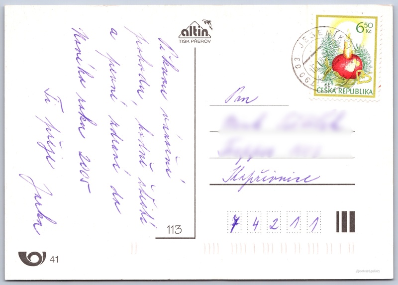 Christmas card Pokud chcete vidět pohlednice ve vyšším rozlišení nebo zobrazovat jejich zadní stranu, tak se prosím nejdříve přihlašte Log in Register Veselé Vánoce Language of printed text on postcard: Czech Publisher: altin, Tisk Přerov (Czechia) Estimated issue date of postcard: 2001 - 2004 Help us specify date of postcard publishing Postcard size (w x h) and shape: 146 x 103 mm (5.75" x 4.06"), rectangle Used postcard:Stamp date: 16.12.2004 Prices: Paid stamps: 6,50 Kč (CZK) Postcard codes: 113 ČP 41 DiscussionAdd post Add new folder ... Manage folders ...