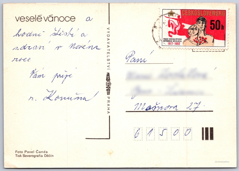 Christmas cards, flasks Pokud chcete vidět pohlednice ve vyšším rozlišení nebo zobrazovat jejich zadní stranu, tak se prosím nejdříve přihlašte Log in Register veselé vánoce Language of printed text on postcard: Czech Publisher: PressFoto Praha (Czechoslovakia) Estimated issue date of postcard: 1980 - 1983 Help us specify date of postcard publishing Postcard size (w x h) and shape: 148 x 104 mm (5.83" x 4.09"), rectangle Persons connected with this postcard: Pavel Čanda(Photo author) Used postcard Prices: Paid stamps: 0,50 Kčs (CSK) DiscussionAdd post Add new folder ... Manage folders ...