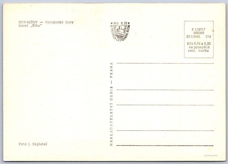 Chvalčov, hotel Říka Pokud chcete vidět pohlednice ve vyšším rozlišení nebo zobrazovat jejich zadní stranu, tak se prosím nejdříve přihlašte Log in Register CHVALČOV - Hostýnské horyHotel "Říka" Language of printed text on postcard: Czech Na Říce 59, Chvalčov, 768 72, Kroměříž show on map Publisher: Nakladatelství Orbis (Czechoslovakia) Issue year of postcard: February, 1964 Postcard size (w x h) and shape: 145 x 102 mm (5.71" x 4.02"), rectangle Persons connected with this postcard: J. Zapletal(Photo author) Unused postcard Prices: Postcard price: 0,70 Kčs (CSK) (+0,20 Kčs fee to support tourism) Postcard codes: F 135717 062305 20 3 9841 264 DiscussionAdd post Add new folder ... Manage folders ...