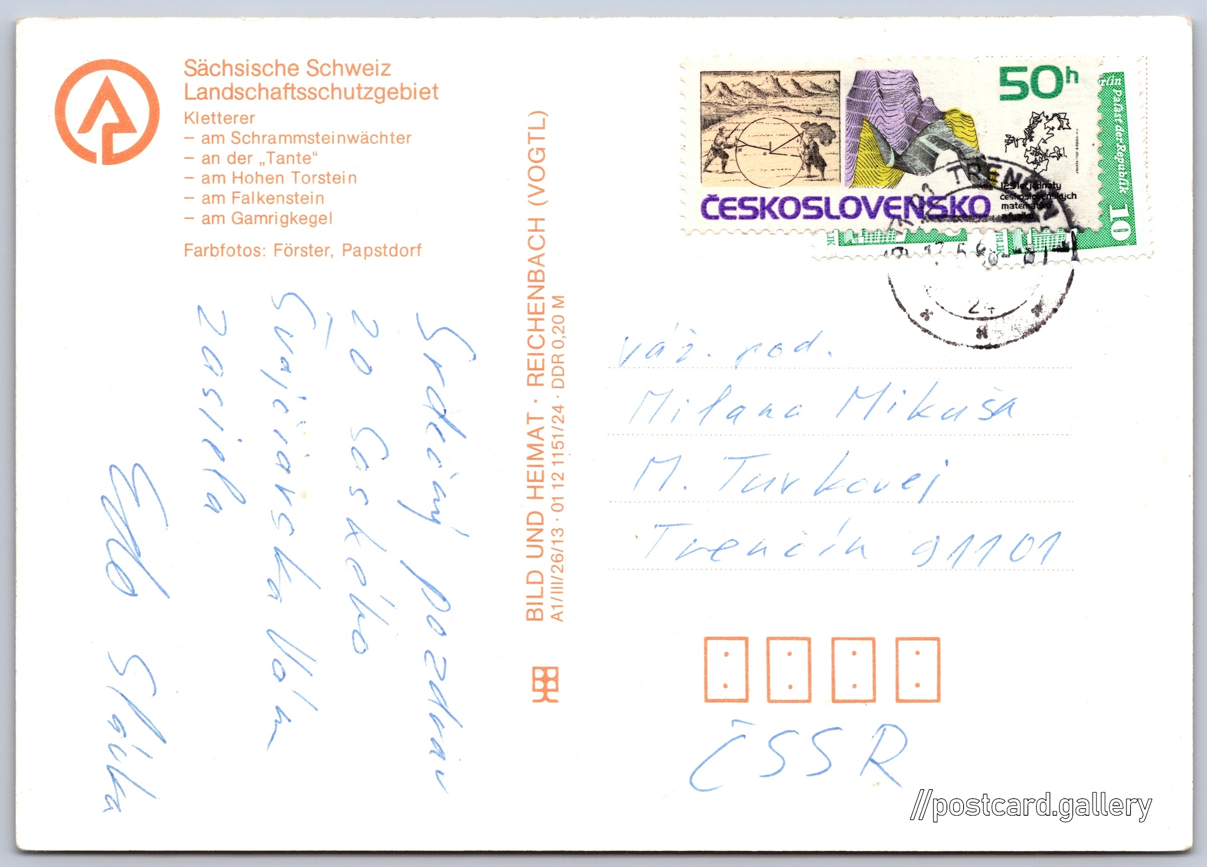 Climbing in Saxon Switzerland Pokud chcete vidět pohlednice ve vyšším rozlišení nebo zobrazovat jejich zadní stranu, tak se prosím nejdříve přihlašte Log in Register Klettern in der Sächsischen Schweiz Sächsische SchweizLandschaftsschutzgebietKletterer- am Schrammsteinwächter- an der „Tante"- am Hohen Torstein- am Falkenstein- am GamrigkegelFarbfotos: Förster, Papstdorf Language of printed text on postcard: German Schrammsteinwächter, Hora, výškový bod, Bad Schandau, Německo show on map 4 other postcards can be found in the immediate vicinity of the place shown on the postcard Show near postcards Publisher: Bild und Heimat (Germany) Estimated issue date of postcard: 1985 - 1988 Help us specify date of postcard publishing Postcard size (w x h) and shape: 148 x 105 mm (5.83" x 4.13"), rectangle Used postcard:Stamp date: 12.5.1988 Prices: Postcard price: 0,20 M (MDN)Paid stamps: 0,50 Kčs (CSK) Postcard codes: A1/III/26/13 01 12 1151/24 DiscussionAdd post Add new folder ... Manage folders ...