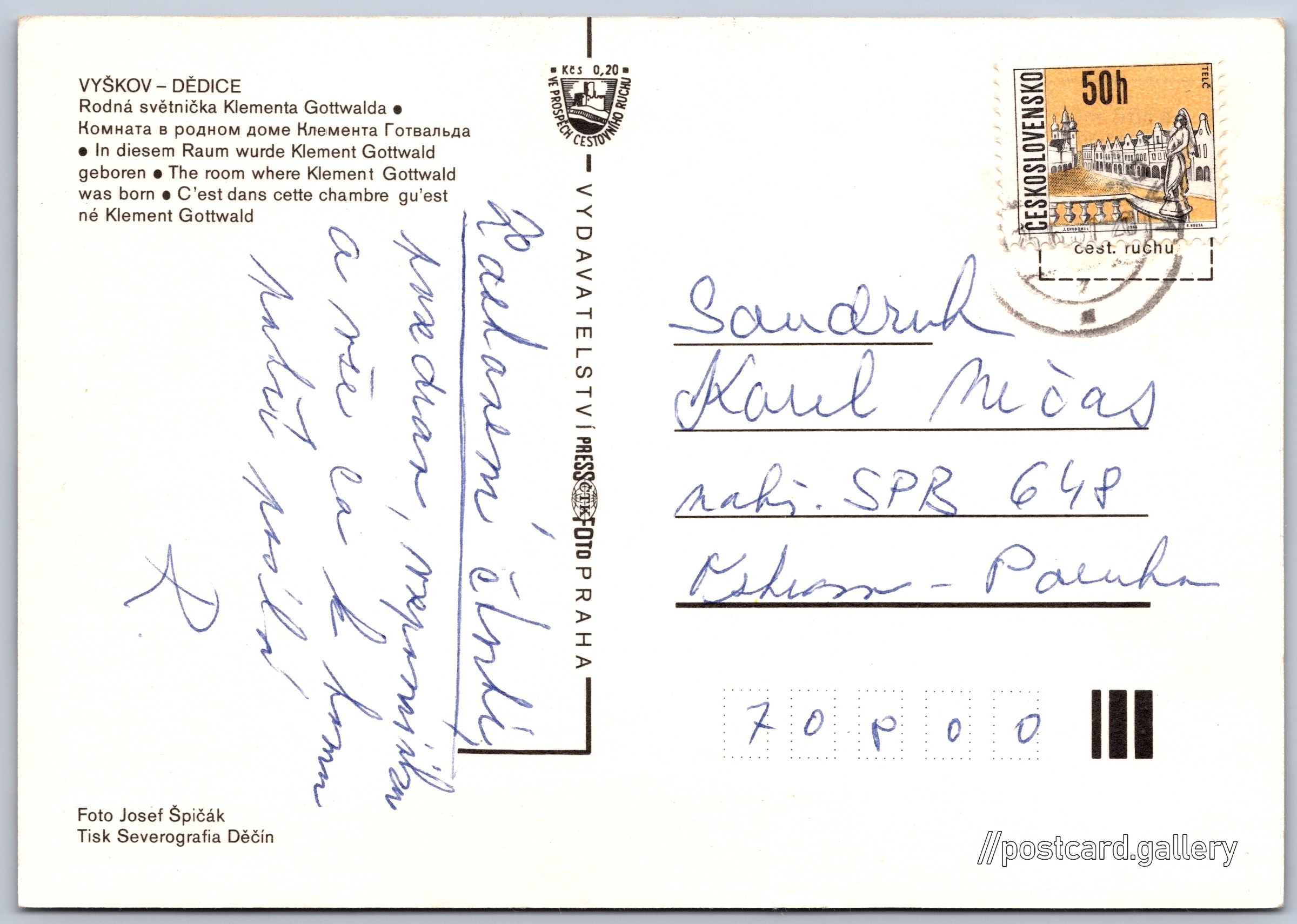 Dědice, the birthplace of Klement Gottwald 6/6 Pokud chcete vidět pohlednice ve vyšším rozlišení nebo zobrazovat jejich zadní stranu, tak se prosím nejdříve přihlašte Log in Register VYŠKOV - DĚDICE- Rodná světnička Klementa Gottwalda- Комната в родном доме Клемента Готвальда- In diesem Raum wurde Klement Gottwald geboren- The room where Klement Gottwald was born- C'est dans cette chambre gu'est né Klement Gottwald Language of printed text on postcard: Czech Revoluční 102/16, Vyškov, 682 01, Vyškov show on map 2 other postcards can be found in the immediate vicinity of the place shown on the postcard Show near postcards Publisher: PressFoto Praha (Czechoslovakia) Issue date of postcard is not known Help us estimate date of postcard publishing Postcard size (w x h) and shape: 147 x 103 mm (5.79" x 4.06"), rectangle Persons connected with this postcard: Klement Gottwald(Postcard content - text) Josef Špičák(Photo author) Used postcard Prices: Fee to support turism: 0,20 Kčs (CSK)Paid stamps: 0,50 Kčs (CSK) DiscussionAdd post Add new folder ... Manage folders ...