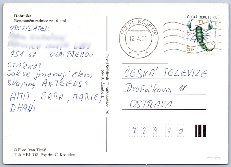 Dobruška, Town Hall Pokud chcete vidět pohlednice ve vyšším rozlišení nebo zobrazovat jejich zadní stranu, tak se prosím nejdříve přihlašte Log in Register Dobruška DobruškaRenesanční radnice ze 16. stol. Language of printed text on postcard: Czech nám. F. L. Věka 1, Dobruška, 518 01, Rychnov nad Kněžnou show on map 7 other postcards can be found in the immediate vicinity of the place shown on the postcard Show near postcards Publisher: Pavel Svědiroh (Czechia) Estimated issue date of postcard: 1998 - 2001 Help us specify date of postcard publishing Postcard size (w x h) and shape: 147 x 105 mm (5.79" x 4.13"), rectangle Persons connected with this postcard: Ivan Tichý(Photo author) Used postcard:Stamp date: 12.4.2001 Prices: Paid stamps: 5,40 Kč (CZK) DiscussionAdd post Add new folder ... Manage folders ...