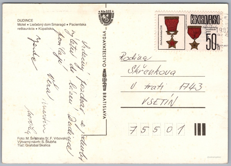 Dudince, spa Pokud chcete vidět pohlednice ve vyšším rozlišení nebo zobrazovat jejich zadní stranu, tak se prosím nejdříve přihlašte Log in Register DUDINCE- Motel- Liečebný dom Smaragd- Pacientska reštaurácia- Kúpalisko Language of printed text on postcard: Slovak Dudince, Město, Slovensko show on map 2 other postcards can be found in the immediate vicinity of the place shown on the postcard Show near postcards Publisher: PressFoto Bratislava (Czechoslovakia) Estimated issue date of postcard: 1984 - 1987 Help us specify date of postcard publishing Postcard size (w x h) and shape: 148 x 105 mm (5.83" x 4.13"), rectangle Persons connected with this postcard: S. Štubňa(Postcard designer) Milan Šmátrala(Photo author) František Vrbovský(Photo author) Used postcard Prices: Fee to support turism: 0,20 Kčs (CSK)Paid stamps: 0,50 Kčs (CSK) DiscussionAdd post Add new folder ... Manage folders ...
