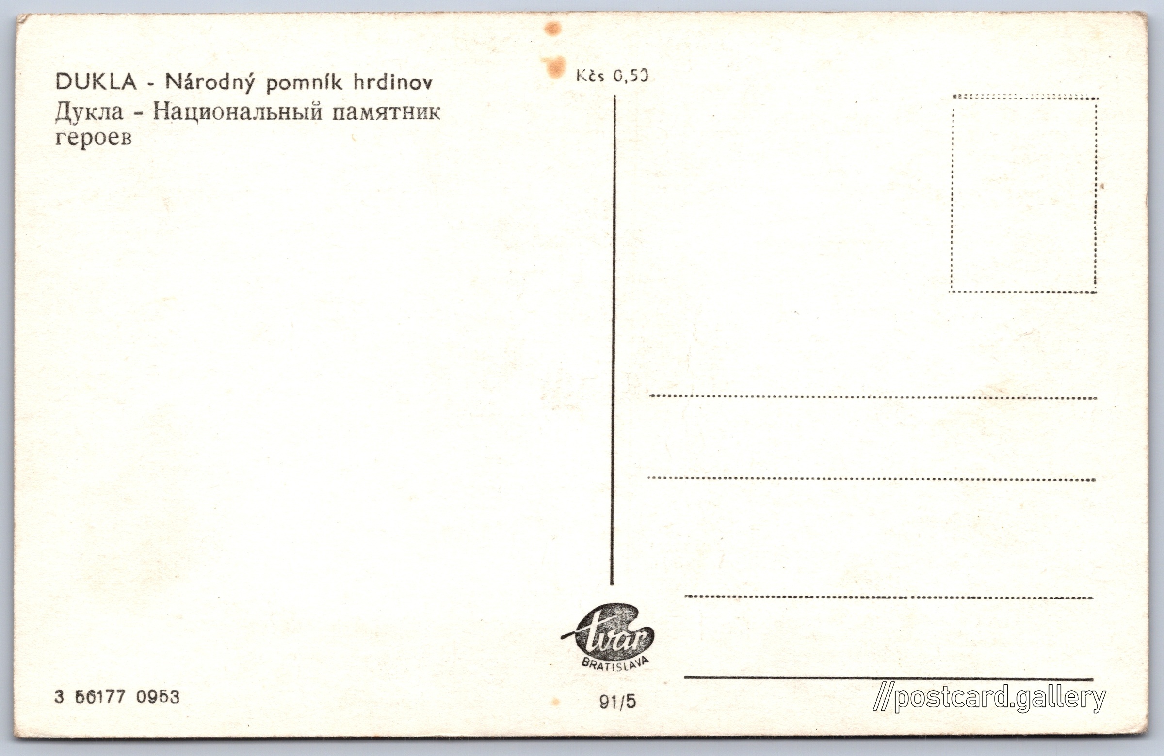 Dukla, monument to heroes Pokud chcete vidět pohlednice ve vyšším rozlišení nebo zobrazovat jejich zadní stranu, tak se prosím nejdříve přihlašte Log in Register DUKLA - Národný pomník hrdinovДукла - Национальный памятник героев Language of printed text on postcard: Slovak, Russian Vyšný Komárnik show on map 10 other postcards can be found in the immediate vicinity of the place shown on the postcard Show near postcards Publisher: Tvar Bratislava (Czechoslovakia) Issue year of postcard: September, 1953 Postcard size (w x h) and shape: 136 x 87 mm (5.35" x 3.43"), rectangle Unused postcard Prices: Postcard price: 0,50 Kčs (CSK) Postcard codes: 3 56177 0953 91/5 DiscussionAdd post Add new folder ... Manage folders ...