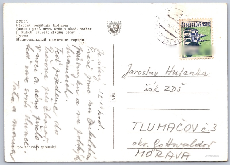 Dukla, National Heroes' Memorial Pokud chcete vidět pohlednice ve vyšším rozlišení nebo zobrazovat jejich zadní stranu, tak se prosím nejdříve přihlašte Log in Register DUKLANárodný pamätník hrdinom(autori: prof. arch. Grus a akad. sochár J. Kulich, laureát štátnej ceny)Дукла - Национальный памятник героев Language of printed text on postcard: Slovak, Russian Vyšný Komárnik show on map Publisher: VPL (Czechoslovakia) Estimated issue date of postcard: 1965 - 1968 Help us specify date of postcard publishing Postcard size (w x h) and shape: 145 x 102 mm (5.71" x 4.02"), rectangle Persons connected with this postcard: Ladislav Sitenský(Photo author) Prof. Arch. Josef Grus(Content of postcard) Ján Kulich(Content of postcard) Used postcard:Stamp date: 17.7.1968 Prices: Fee to support turism: 0,20 Kčs (CSK)Paid stamps: 0,30 Kčs (CSK) DiscussionAdd post Add new folder ... Manage folders ...