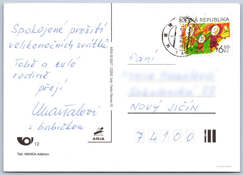 Easter greetings Pokud chcete vidět pohlednice ve vyšším rozlišení nebo zobrazovat jejich zadní stranu, tak se prosím nejdříve přihlašte Log in Register Veselé Velikonoce Language of printed text on postcard: Czech Publisher: ARIA-Cards (Czechia) Estimated issue date of postcard: 2001 - 2004 Help us specify date of postcard publishing Postcard size (w x h) and shape: 147 x 105 mm (5.79" x 4.13"), rectangle Persons connected with this postcard: Fedor Nemec(Photo author) Used postcard:Stamp date: 6.4.2004 Prices: Paid stamps: 6,50 Kč (CZK) Postcard codes: ČP 12 DiscussionAdd post Add new folder ... Manage folders ...
