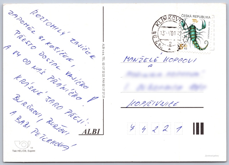Easter greetings Pokud chcete vidět pohlednice ve vyšším rozlišení nebo zobrazovat jejich zadní stranu, tak se prosím nejdříve přihlašte Log in Register Veselé Velikonoce Language of printed text on postcard: Czech Publisher: ALBI (Czechia) Estimated issue date of postcard: 1998 - 2001 Help us specify date of postcard publishing Postcard size (w x h) and shape: 147 x 105 mm (5.79" x 4.13"), rectangle Used postcard:Stamp date: 13.4.2001 Prices: Paid stamps: 5,40 Kč (CZK) Postcard codes: ČP 11 DiscussionAdd post Add new folder ... Manage folders ...