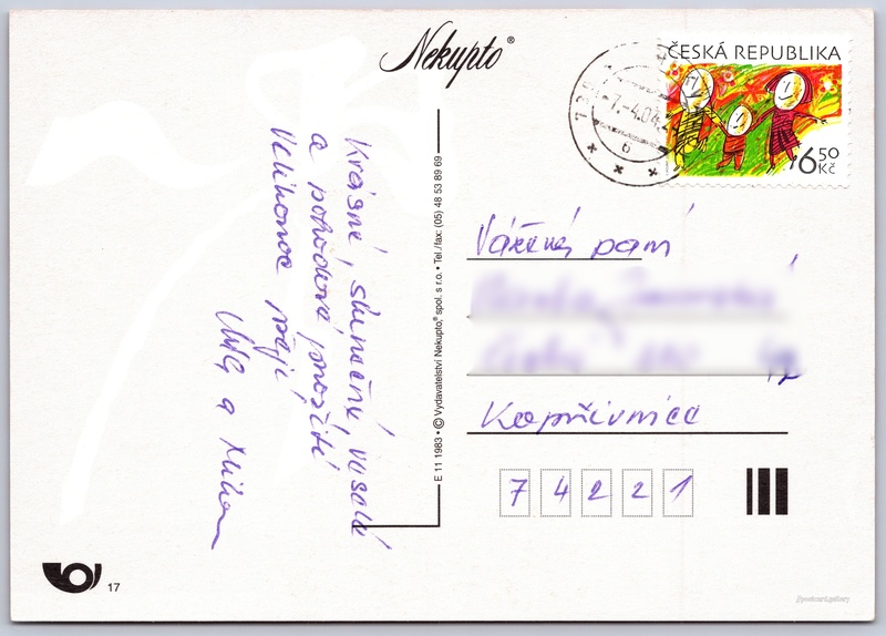 Easter greetings Pokud chcete vidět pohlednice ve vyšším rozlišení nebo zobrazovat jejich zadní stranu, tak se prosím nejdříve přihlašte Log in Register Veselé Velikonoce Language of printed text on postcard: Czech Publisher: Nekupto (Czechia) Estimated issue date of postcard: 2001 - 2004 Help us specify date of postcard publishing Postcard size (w x h) and shape: 148 x 105 mm (5.83" x 4.13"), rectangle Used postcard:Stamp date: 7.4.2004 Prices: Paid stamps: 6,50 Kč (CZK) Postcard codes: E 11 1983 DiscussionAdd post Add new folder ... Manage folders ...