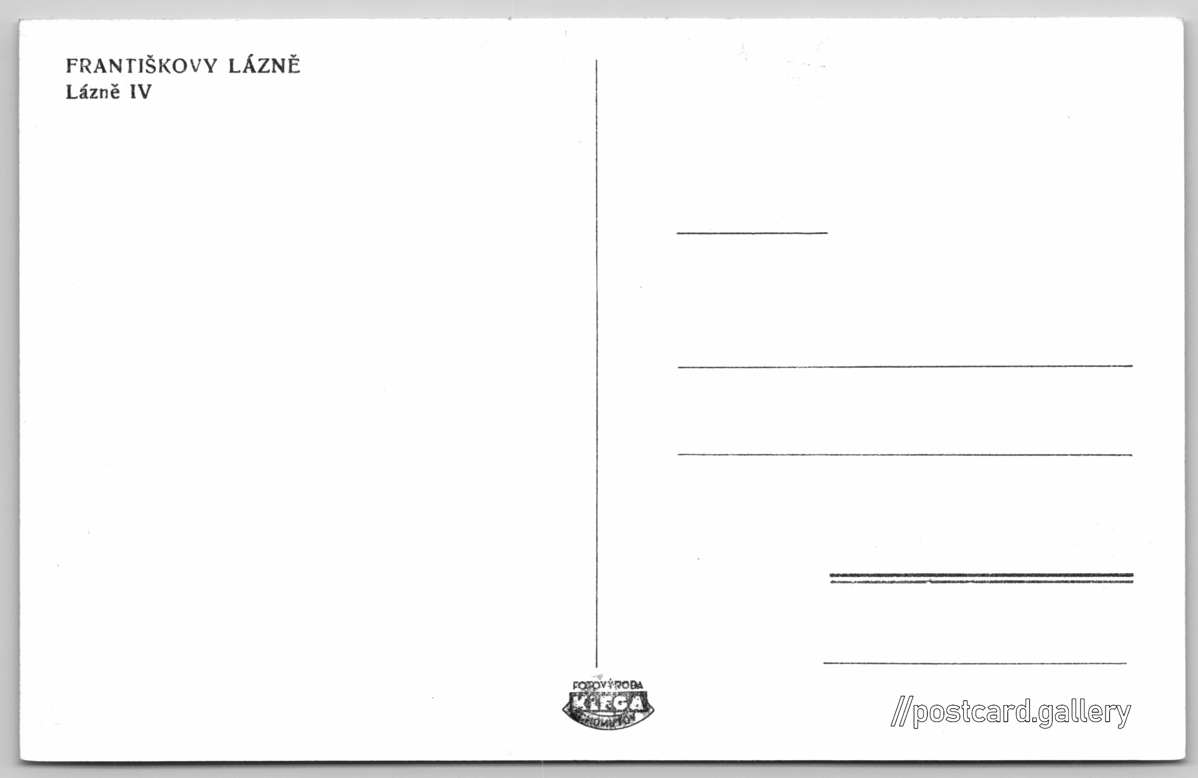 Františkovy lázně, Lázně IV. Pokud chcete vidět pohlednice ve vyšším rozlišení nebo zobrazovat jejich zadní stranu, tak se prosím nejdříve přihlašte Log in Register FRANTIŠKOVY LÁZNĚLázně IVFOTOVÝROBAKIFGA Language of printed text on postcard: Czech Františkovy Lázně, Cheb show on map 51 other postcards can be found in the immediate vicinity of the place shown on the postcard Show near postcards Publisher: Fotovýroba Klega (Czechoslovakia) Issue date of postcard is not known Help us estimate date of postcard publishing Postcard size (w x h) and shape: 136 x 87 mm (5.35" x 3.43"), rectangle Unused postcard DiscussionAdd post Add new folder ... Manage folders ...