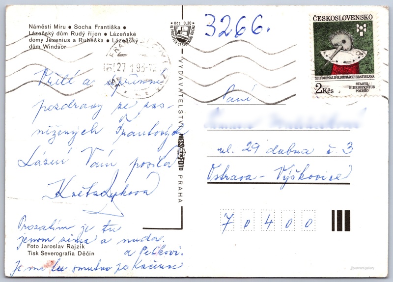 Františkovy Lázně Pokud chcete vidět pohlednice ve vyšším rozlišení nebo zobrazovat jejich zadní stranu, tak se prosím nejdříve přihlašte Log in Register Františkovy Lázně - Náměstí Míru- Socha Františka- Lázeňský dům Rudý říjen- Lázeňské domy Jesenius a Rubeška- Lázeňský dům Windsor Language of printed text on postcard: Czech Františkovy Lázně, Cheb show on map Publisher: PressFoto Praha (Czechoslovakia) Estimated issue date of postcard: 1990 - 1993 Help us specify date of postcard publishing Postcard size (w x h) and shape: 148 x 105 mm (5.83" x 4.13"), rectangle Persons connected with this postcard: Jaroslav Rajzík(Photo author) Used postcard:Stamp date: 27.1.1993 Prices: Fee to support turism: 0,20 Kčs (CSK)Paid stamps: 2,00 Kčs (CSK) DiscussionAdd post Add new folder ... Manage folders ...