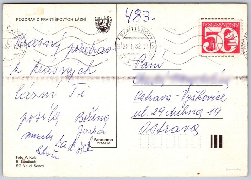 Františkovy Lázně Pokud chcete vidět pohlednice ve vyšším rozlišení nebo zobrazovat jejich zadní stranu, tak se prosím nejdříve přihlašte Log in Register Františkovy Lázně POZDRAV Z FRANTIŠKOVÝCH LÁZNÍ Language of printed text on postcard: Czech Dvorana Glauberových pramenů, Historická budova, Františkovy Lázně, Česko show on map Publisher: Panorama (Czechoslovakia) Estimated issue date of postcard: 1979 - 1982 Help us specify date of postcard publishing Postcard size (w x h) and shape: 148 x 104 mm (5.83" x 4.09"), rectangle Persons connected with this postcard: Bohumil Landisch(Photo author) Vlastimil Kula(Photo author) Used postcard:Stamp date: 28.6.1982 Prices: Postcard price: 1,40 Kčs (CSK) (+0,20 Kčs fee to support tourism)Paid stamps: 0,50 Kčs (CSK) Postcard codes: 6-1960 130302101 1002 DiscussionAdd post Add new folder ... Manage folders ...