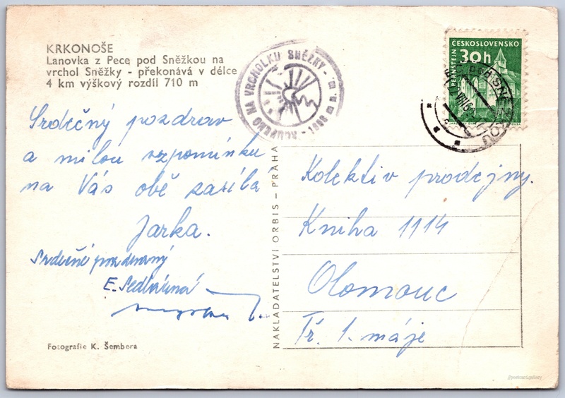 Giant Mountains, cableway to Snezka Pokud chcete vidět pohlednice ve vyšším rozlišení nebo zobrazovat jejich zadní stranu, tak se prosím nejdříve přihlašte Log in Register KRKONOŠELanovka z Pece pod Sněžkou na vrchol Sněžky - překonává v délce4 km výškový rozdíl 710 m. Language of printed text on postcard: Czech Velká Úpa, Pec pod Sněžkou, Trutnov show on map 37 other postcards can be found in the immediate vicinity of the place shown on the postcard Show near postcards Publisher: Nakladatelství Orbis (Czechoslovakia) Estimated issue date of postcard: 1957 - 1960 Help us specify date of postcard publishing Postcard size (w x h) and shape: 147 x 102 mm (5.79" x 4.02"), rectangle Persons connected with this postcard: K. Šembera(Photo author) Used postcard:Stamp date: 22.8.1960 Prices: Paid stamps: 0,30 Kčs (CSK) DiscussionAdd post Add new folder ... Manage folders ...