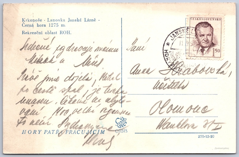 Giant Mountains, cableway to the Black Mountain Pokud chcete vidět pohlednice ve vyšším rozlišení nebo zobrazovat jejich zadní stranu, tak se prosím nejdříve přihlašte Log in Register Krkonoše - Lanovka Janské Lázně - Černá hora 1275 m.Rekreační oblast ROH.HORY PATŘ PRACUJÍCÍM Language of printed text on postcard: Czech Janské Lázně, Trutnov show on map 20 other postcards can be found in the immediate vicinity of the place shown on the postcard Show near postcards Publisher: Nakladatelství Orbis (Czechoslovakia) Estimated issue date of postcard: 1948 - 1950 Help us specify date of postcard publishing Postcard size (w x h) and shape: 139 x 90 mm (5.47" x 3.54"), rectangle Used postcard:Stamp date: 11.5.1950 Prices: Paid stamps: 1,50 Kčs (CSK) Postcard codes: 270-12-10 DiscussionAdd post Add new folder ... Manage folders ...