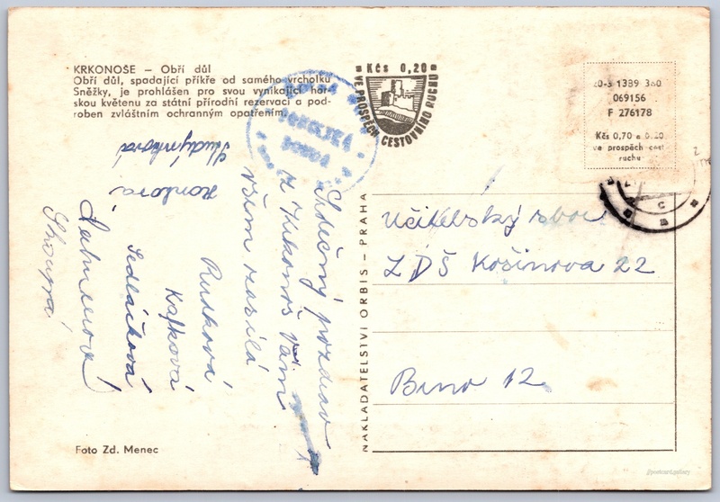 Giant Mountains, Giant Mine Pokud chcete vidět pohlednice ve vyšším rozlišení nebo zobrazovat jejich zadní stranu, tak se prosím nejdříve přihlašte Log in Register KRKONOŠE - Obří důlObří důl, spadající příkře od samého vrcholku Sněžky, je prohlášen pro svou vynikající horskou květenu za státní přírodní rezervaci a podroben zvláštním ochranným opatřením. Language of printed text on postcard: Czech Obří důl, Kaňon, rokle, soutěska, údolí, Pec pod Sněžkou, Česko show on map 43 other postcards can be found in the immediate vicinity of the place shown on the postcard Show near postcards Publisher: Nakladatelství Orbis (Czechoslovakia) Issue year of postcard: March, 1960 Postcard size (w x h) and shape: 148 x 101 mm (5.83" x 3.98"), rectangle Persons connected with this postcard: Zdeněk Menec(Photo author) Used postcard Prices: Postcard price: 0,70 Kčs (CSK) (+0,20 Kčs fee to support tourism) Postcard codes: 20-3 1389 360 069156 F 276178 DiscussionAdd post Add new folder ... Manage folders ...
