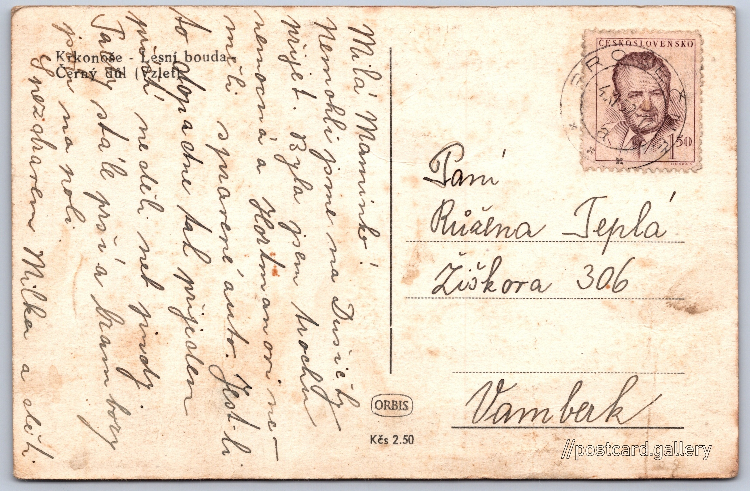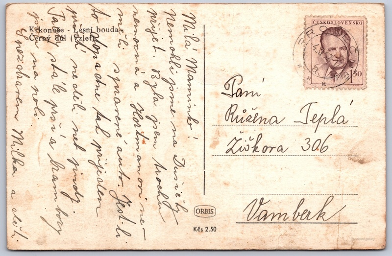 Giant Mountains, Lesní bouda Pokud chcete vidět pohlednice ve vyšším rozlišení nebo zobrazovat jejich zadní stranu, tak se prosím nejdříve přihlašte Log in Register Krkonoše - Lesní boudaČerný důl (Vzlet) Language of printed text on postcard: Czech Lesní bouda, Chata, bouda, Černý Důl 187, Černý Důl, Česko show on map 19 other postcards can be found in the immediate vicinity of the place shown on the postcard Show near postcards Publisher: Nakladatelství Orbis (Czechoslovakia) Estimated issue date of postcard: 1949 - 1952 Help us specify date of postcard publishing Postcard size (w x h) and shape: 140 x 91 mm (5.51" x 3.58"), rectangle Used postcard:Stamp date: 4.11.1952 Prices: Postcard price: 2,50 Kčs (CSK)Paid stamps: 1,50 Kčs (CSK) DiscussionAdd post Add new folder ... Manage folders ...