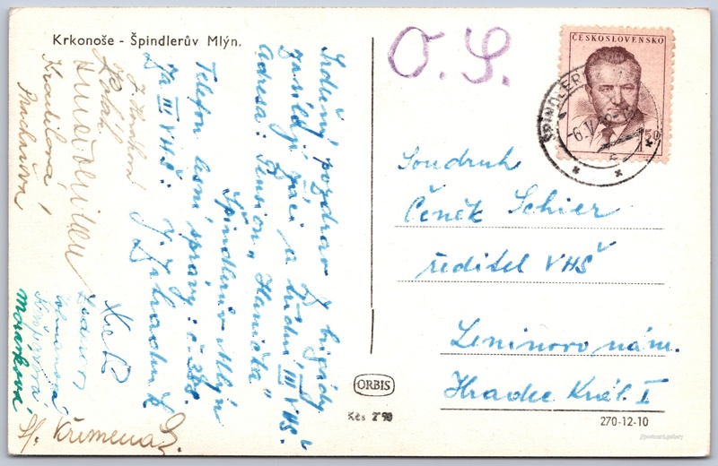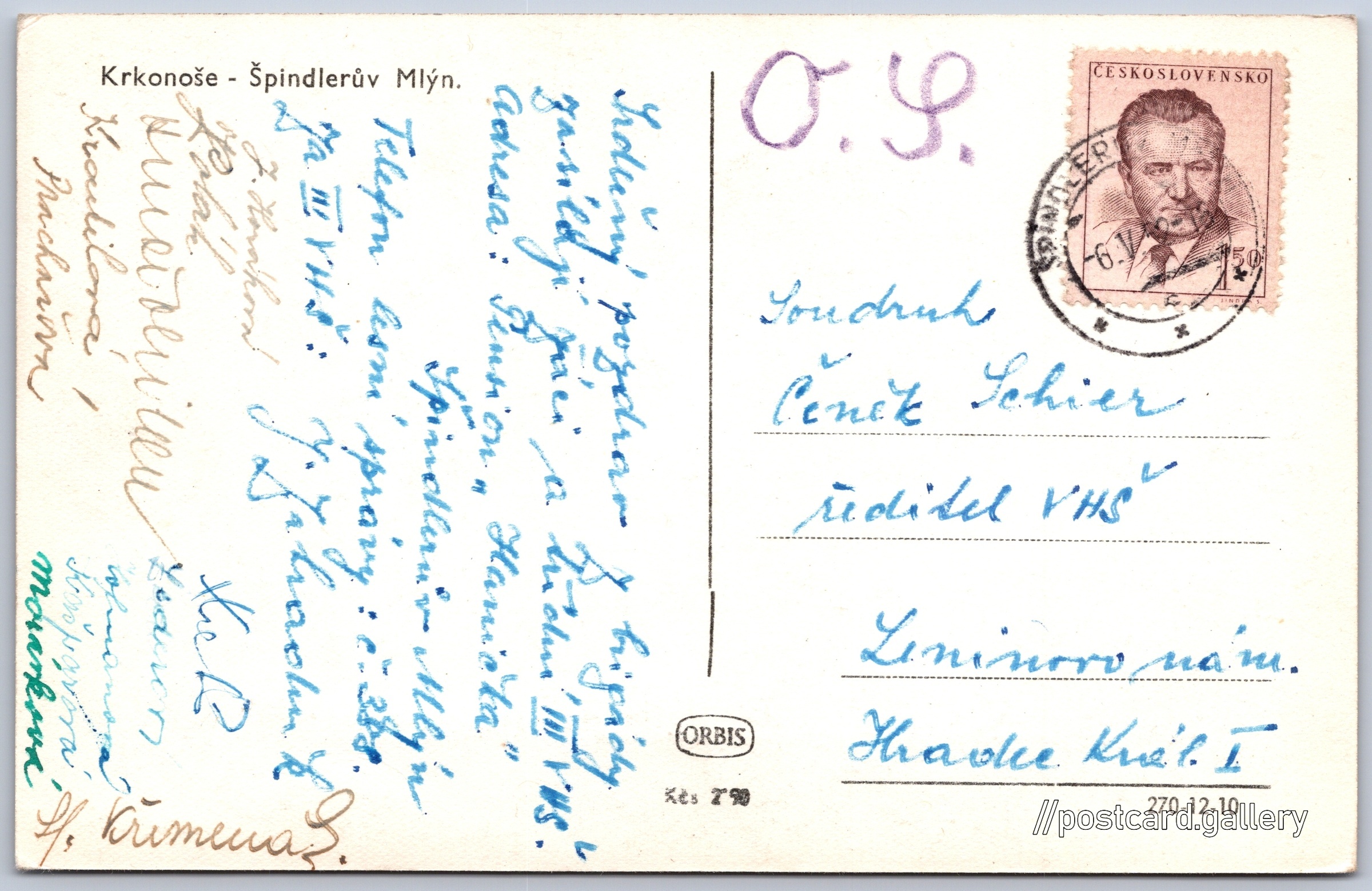 Giant Mountains, Spindleruv Mlyn Pokud chcete vidět pohlednice ve vyšším rozlišení nebo zobrazovat jejich zadní stranu, tak se prosím nejdříve přihlašte Log in Register Krkonoše - Špindlerův Mlýn. Language of printed text on postcard: Czech Špindlerův Mlýn, Město, Česko show on map Publisher: Nakladatelství Orbis (Czechoslovakia) Estimated issue date of postcard: 1949 - 1952 Help us specify date of postcard publishing Postcard size (w x h) and shape: 139 x 89 mm (5.47" x 3.50"), rectangle Used postcard:Stamp date: 6.5.1952 Prices: Postcard price: 2,50 Kčs (CSK)Paid stamps: 1,50 Kčs (CSK) Postcard codes: 270-12-10 DiscussionAdd post Add new folder ... Manage folders ...