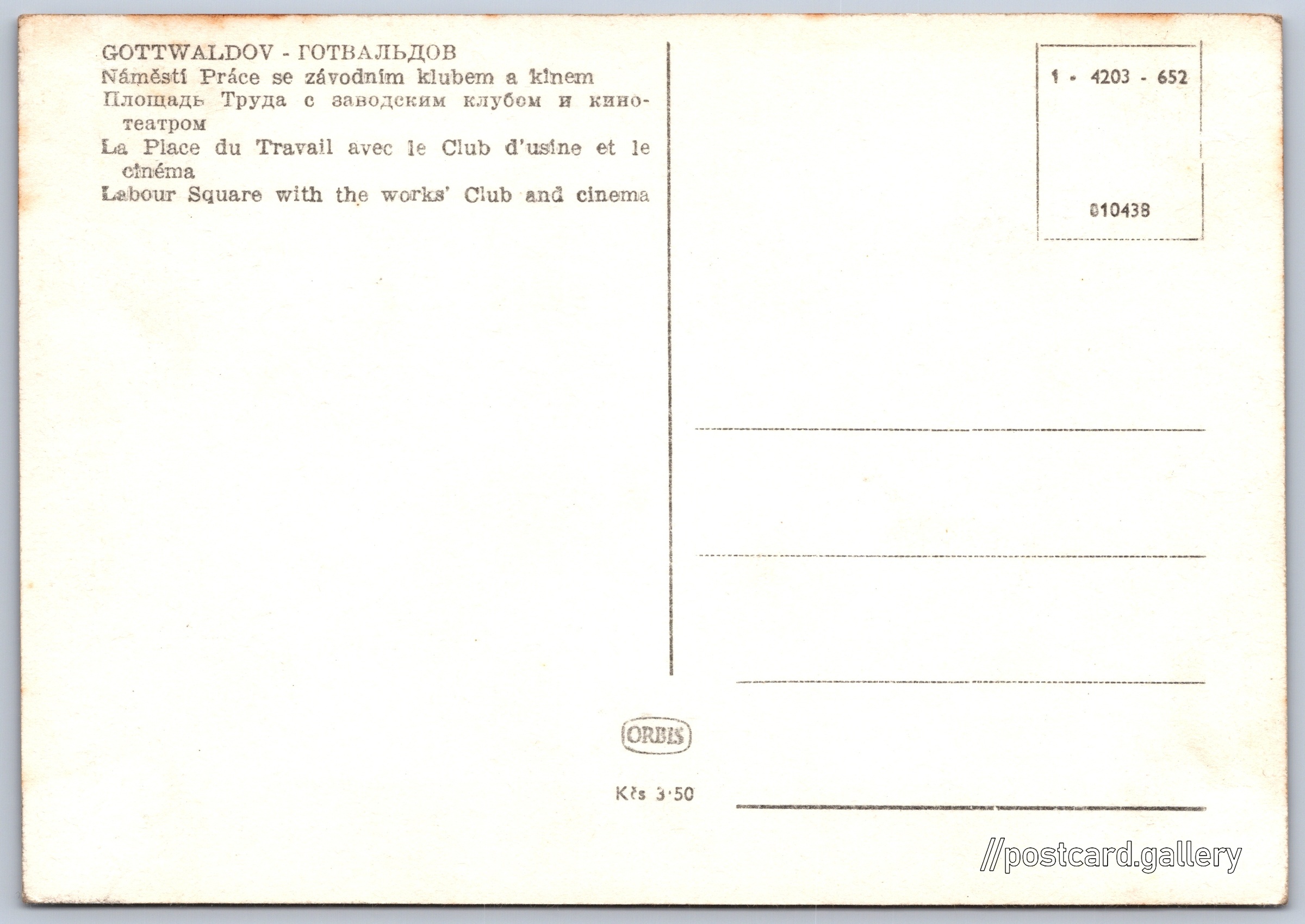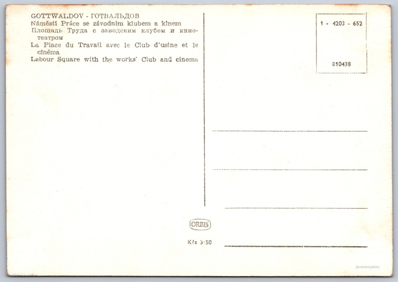Gottwaldov, Labour Square Pokud chcete vidět pohlednice ve vyšším rozlišení nebo zobrazovat jejich zadní stranu, tak se prosím nejdříve přihlašte Log in Register GOTTWALDOV - ГОТВАЛЬДОВ- Náměstí Práce se závodním klubem a kinem- Площадь Труда с заводским клубем и кинотеатром- La Place du Travail avec le Club d'usine et le cinéma- Labour Square with the works' Club and cinema Language of printed text on postcard: English náměstí Práce, Zlín, Zlín show on map 10 other postcards can be found in the immediate vicinity of the place shown on the postcard Show near postcards Publisher: Nakladatelství Orbis (Czechoslovakia) Issue year of postcard: June, 1952 Postcard size (w x h) and shape: 146 x 102 mm (5.75" x 4.02"), rectangle Unused postcard Prices: Postcard price: 3,50 Kčs (CSK) Postcard codes: 1-4203-652 010438 DiscussionAdd post Add new folder ... Manage folders ...