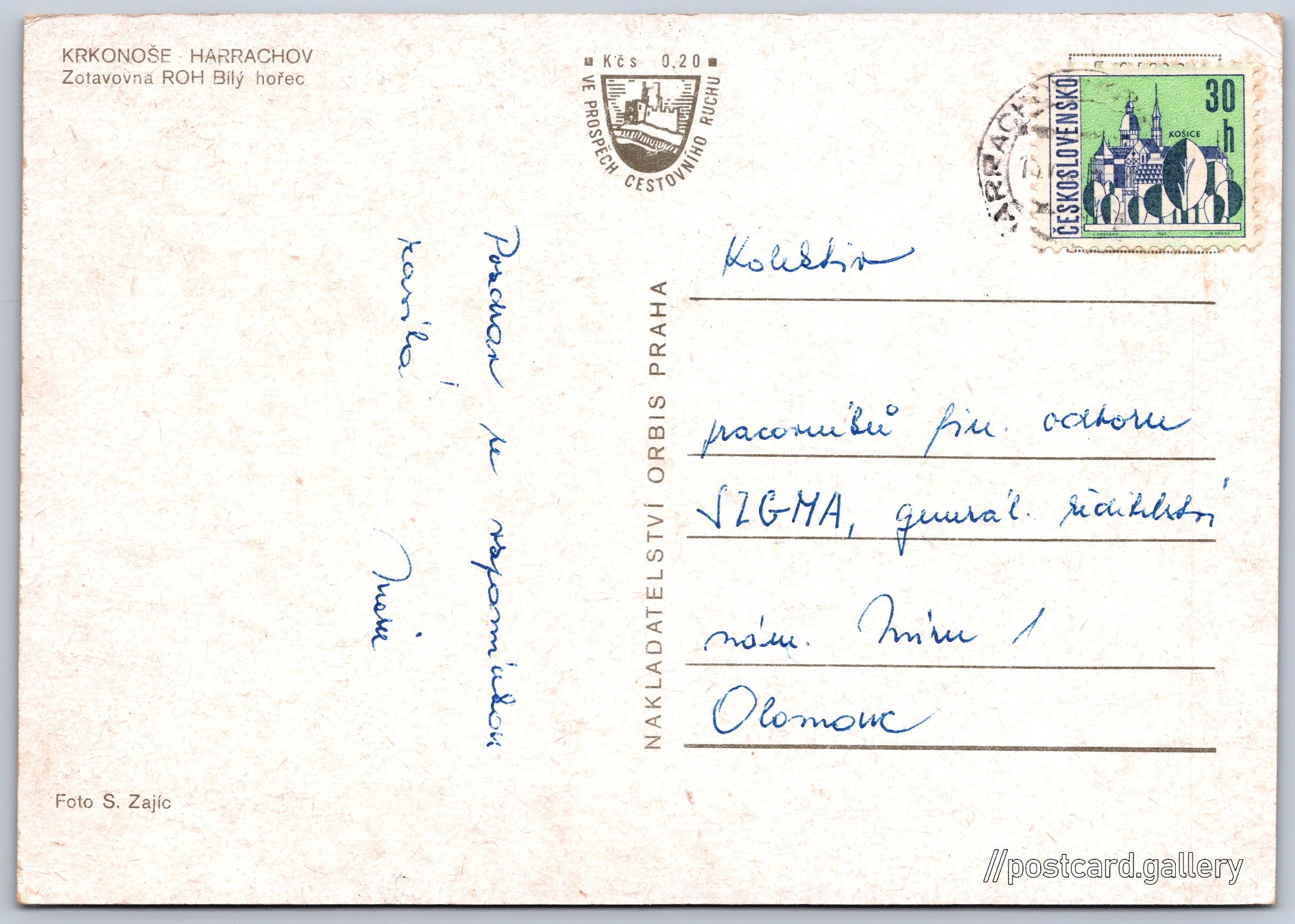 Harrachov, rest home ROH Bílý hořec Pokud chcete vidět pohlednice ve vyšším rozlišení nebo zobrazovat jejich zadní stranu, tak se prosím nejdříve přihlašte Log in Register KRKONOŠE - HARRACHOVZotavovna ROH Bílý hořec Language of printed text on postcard: Czech Spa Hotel Bílý Hořec, Harrachov 178, Harrachov, Česko show on map 4 other postcards can be found in the immediate vicinity of the place shown on the postcard Show near postcards Publisher: Nakladatelství Orbis (Czechoslovakia) Issue date of postcard is not known Help us estimate date of postcard publishing Postcard size (w x h) and shape: 148 x 105 mm (5.83" x 4.13"), rectangle Persons connected with this postcard: Stanislav Zajic(Photo author) Used postcard Prices: Fee to support turism: 0,20 Kčs (CSK)Paid stamps: 0,30 Kčs (CSK) DiscussionAdd post Add new folder ... Manage folders ...
