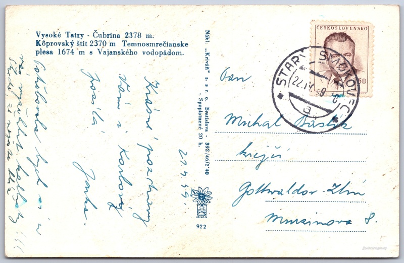 High Tatras, Čubrina Pokud chcete vidět pohlednice ve vyšším rozlišení nebo zobrazovat jejich zadní stranu, tak se prosím nejdříve přihlašte Log in Register Vysoké Tatry - Čubrina 2378 m.Kôprovský štít 2370 m, Temnosmrečianske plesa 1674 m s Vajanského vodopádom. Language of printed text on postcard: Slovak Čubrina (2376 m), Hora, výškový bod, Vysoké Tatry - Štrbské Pleso, Slovensko show on map 70 other postcards can be found in the immediate vicinity of the place shown on the postcard Show near postcards Publisher: Kriváň (Czechoslovakia) Issue year of postcard: 1946 Postcard size (w x h) and shape: 139 x 90 mm (5.47" x 3.54"), rectangle Used postcard:Stamp date: 22.4.1949Write date: 21.4.1949 Prices: Postcard price: 2,40 Kčs (CSK) (+0,20 Kčs fee to support tourism)Paid stamps: 1,50 Kčs (CSK) Postcard codes: 392/46 922 DiscussionAdd post Add new folder ... Manage folders ...