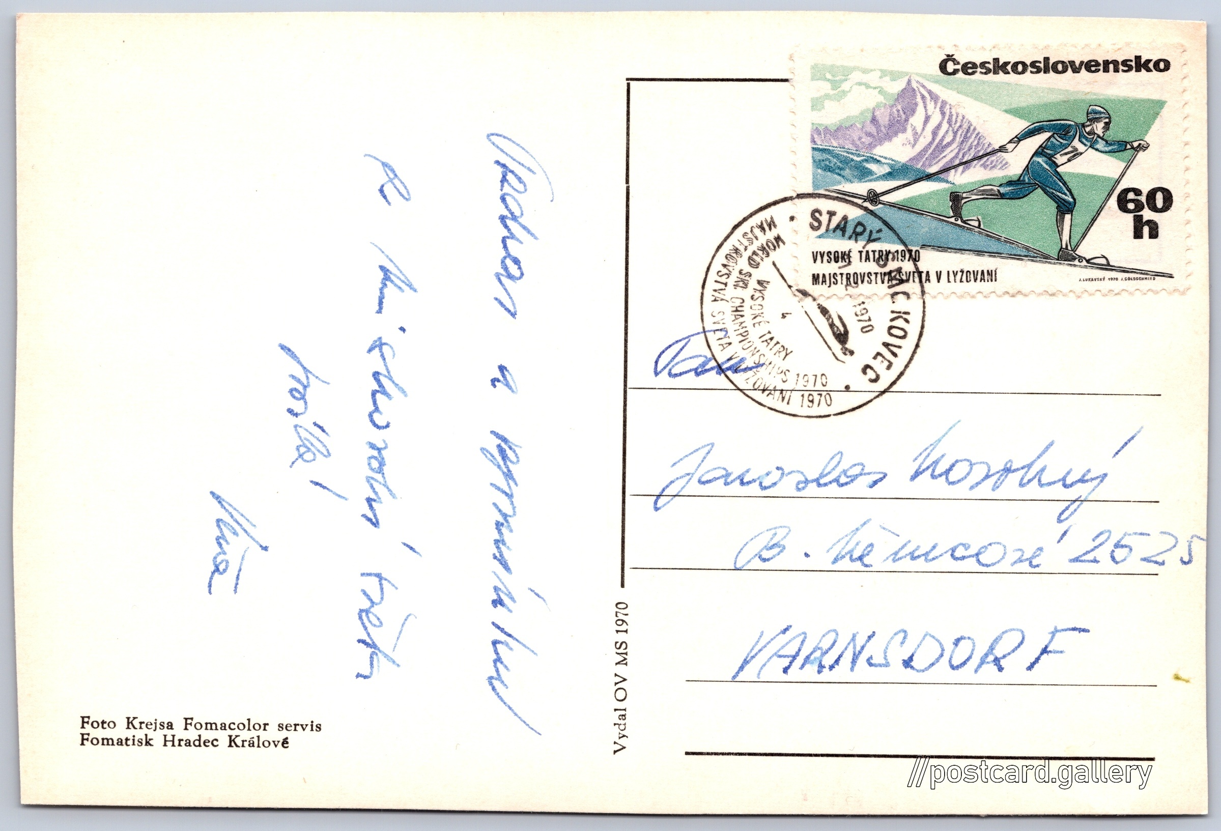 High Tatras, FIS World Championship 1970 4/127 Pokud chcete vidět pohlednice ve vyšším rozlišení nebo zobrazovat jejich zadní stranu, tak se prosím nejdříve přihlašte Log in Register Vysoké TatryHigh TatrasHohe TatraLes Hautes TatrasMS 1970 FIS Vysoké Tatry Foto Krejsa Fomacolor servisFomatisk Hradec Králové Language of printed text on postcard: Slovak 55C7+VH Vysoké Tatry, Slovakia show on map The exact location is unknown. If you know it, please write it in the comments or mark it on the map Publisher: OV MS 1970 (Czechoslovakia) Issue year of postcard: 1970 Postcard size (w x h) and shape: 159 x 107 mm (6.26" x 4.21"), rectangle Used postcard:Stamp date: 21.2.1970 Prices: Paid stamps: 0,60 Kčs (CSK) DiscussionAdd post Add new folder ... Manage folders ...