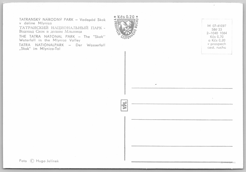 High Tatras, Skok waterfall 8/109 Pokud chcete vidět pohlednice ve vyšším rozlišení nebo zobrazovat jejich zadní stranu, tak se prosím nejdříve přihlašte Log in Register TATRANSKÝ NÁRODNÝ PARK - Vodopád Skok v doline MlynicaТАТРАНСКИЙ НАЦИОНАЛЬНЫЙ ПАРК - Водопад Скок в долине МлыницаTHE TATRA NATONAL PARK - The "Skok" Waterfall in the Mlynica ValleyTATRA NATIONALPARK - Der Wasserfall "Skok" im Mlynica-Tal Language of printed text on postcard: Slovak Vodopád Skok, Vodopád, Štrba, Slovensko show on map 108 other postcards can be found in the immediate vicinity of the place shown on the postcard Show near postcards Publisher: VPL (Czechoslovakia) Issue year of postcard: October, 1964 Postcard size (w x h) and shape: 150 x 104 mm (5.91" x 4.09"), rectangle Persons connected with this postcard: Hugo Jelínek(Photo author) Unused postcard Prices: Postcard price: 0,70 Kčs (CSK) (+0,20 Kčs fee to support tourism) Postcard codes: M 07-41097 586 33 2-1040 1064 DiscussionAdd post Add new folder ... Manage folders ...