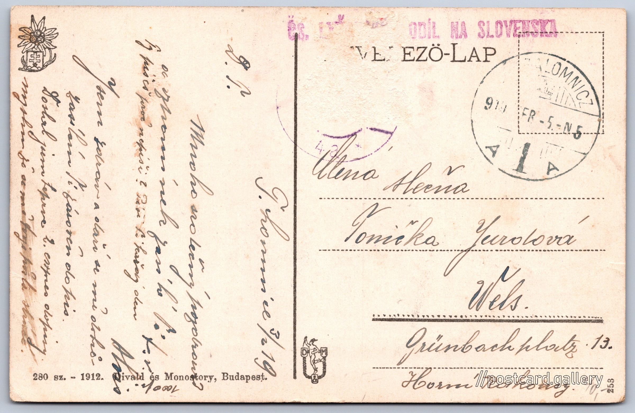 High Tatras, the way to the Green Lake 7/112 Pokud chcete vidět pohlednice ve vyšším rozlišení nebo zobrazovat jejich zadní stranu, tak se prosím nejdříve přihlašte Log in Register A Magas Tátra. - Die Hohe Tatra.A Zöldtóhoz vezető út.Weg zum grünen See. Language of printed text on postcard: Hungarian, German Tatranská Lomnica show on map 118 other postcards can be found in the immediate vicinity of the place shown on the postcard Show near postcards Publisher: Divald és Monostory (Hungary) Issue year of postcard: 1912 Postcard size (w x h) and shape: 137 x 88 mm (5.39" x 3.46"), rectangle Used postcard:Stamp date: 5.2.1919Write date: 3.2.1919 Postcard codes: 280 sz. 253 DiscussionAdd post Add new folder ... Manage folders ...